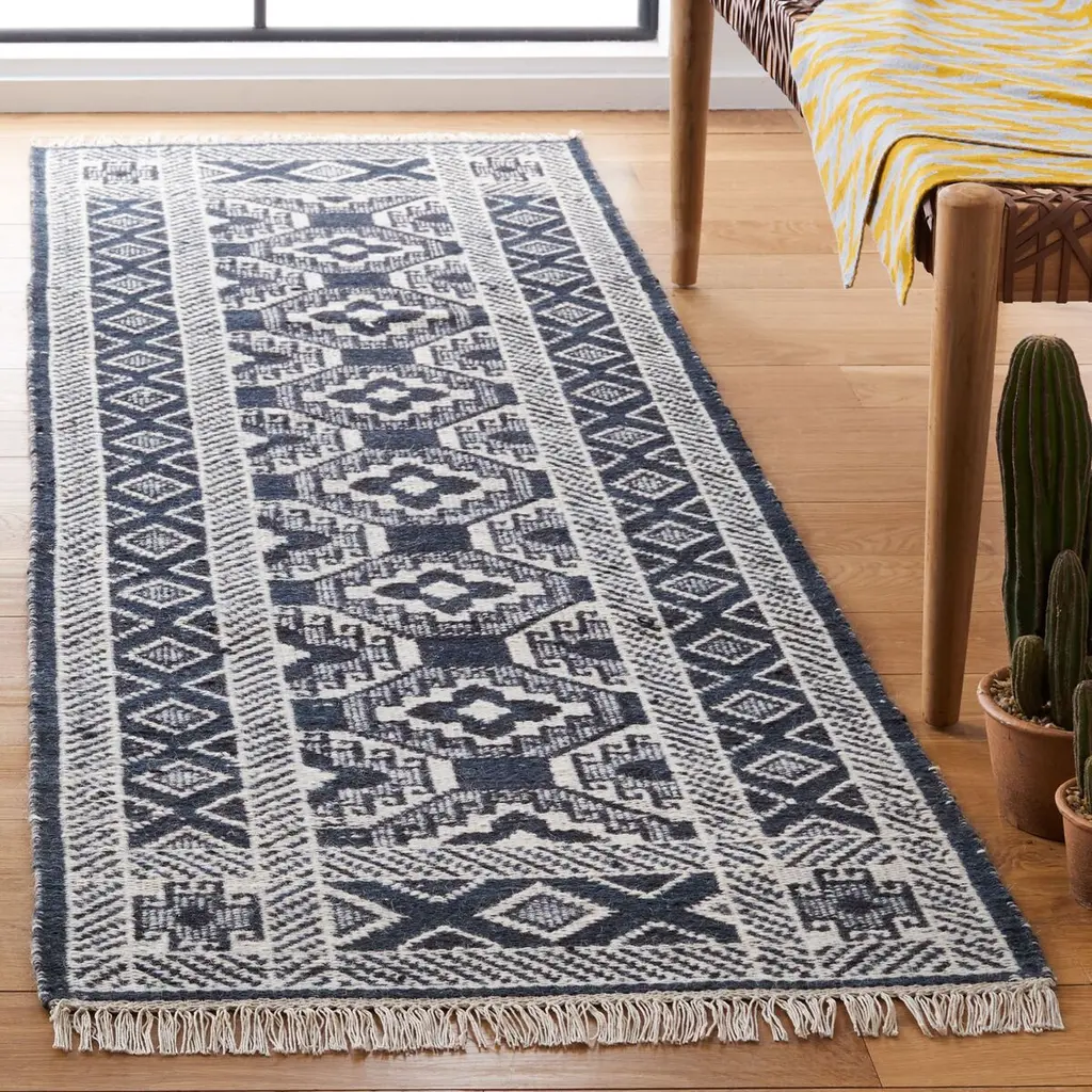 Elevate your space with the timeless elegance of our 3' x 5' Small Rectangle Wool Area Rug. Handcrafted in India using traditional Flat Weave techniques, this rug boasts a low-profile 1/4" height, making it an ideal choice for a variety of settings. Constructed from pure wool, this area rug ensures durability and a soft underfoot feel that is perfect for high-traffic areas. The bold, geometric pattern showcased in the image is captured in beautiful black and ivory hues, offering a sophisticated contrast that will complement any room. This rug features a striking array of octagonal shapes interlinked with intricate border designs, creating a sense of depth and texture that is both visually appealing and tactile. Whether you're styling a contemporary living room, a chic office, or a cozy bedroom, this wool area rug serves as a gorgeous foundation that effortlessly merges artisan craftsmanship with modern aesthetics. Its timeless color palette ensures it will seamlessly integrate with both neutral and color-rich d?cors. Add a touch of artisanal charm and refined style to your space with this exquisite wool rectangle rug, a testament to India's rich textile heritage.