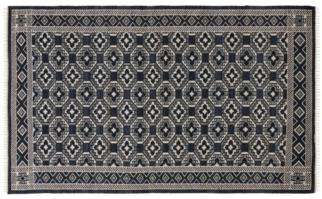 Elevate your space with the timeless elegance of our 3' x 5' Small Rectangle Wool Area Rug. Handcrafted in India using traditional Flat Weave techniques, this rug boasts a low-profile 1/4" height, making it an ideal choice for a variety of settings. Constructed from pure wool, this area rug ensures durability and a soft underfoot feel that is perfect for high-traffic areas. The bold, geometric pattern showcased in the image is captured in beautiful black and ivory hues, offering a sophisticated contrast that will complement any room. This rug features a striking array of octagonal shapes interlinked with intricate border designs, creating a sense of depth and texture that is both visually appealing and tactile. Whether you're styling a contemporary living room, a chic office, or a cozy bedroom, this wool area rug serves as a gorgeous foundation that effortlessly merges artisan craftsmanship with modern aesthetics. Its timeless color palette ensures it will seamlessly integrate with both neutral and color-rich d?cors. Add a touch of artisanal charm and refined style to your space with this exquisite wool rectangle rug, a testament to India's rich textile heritage.