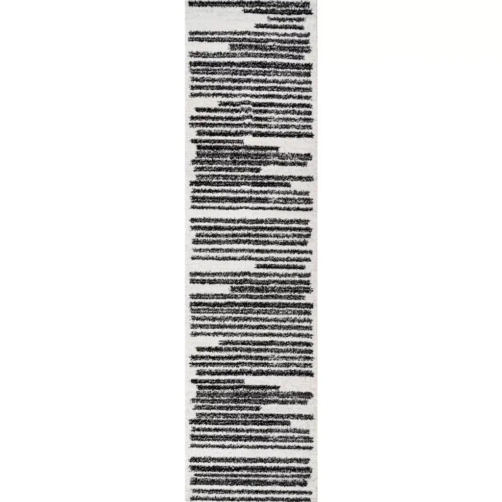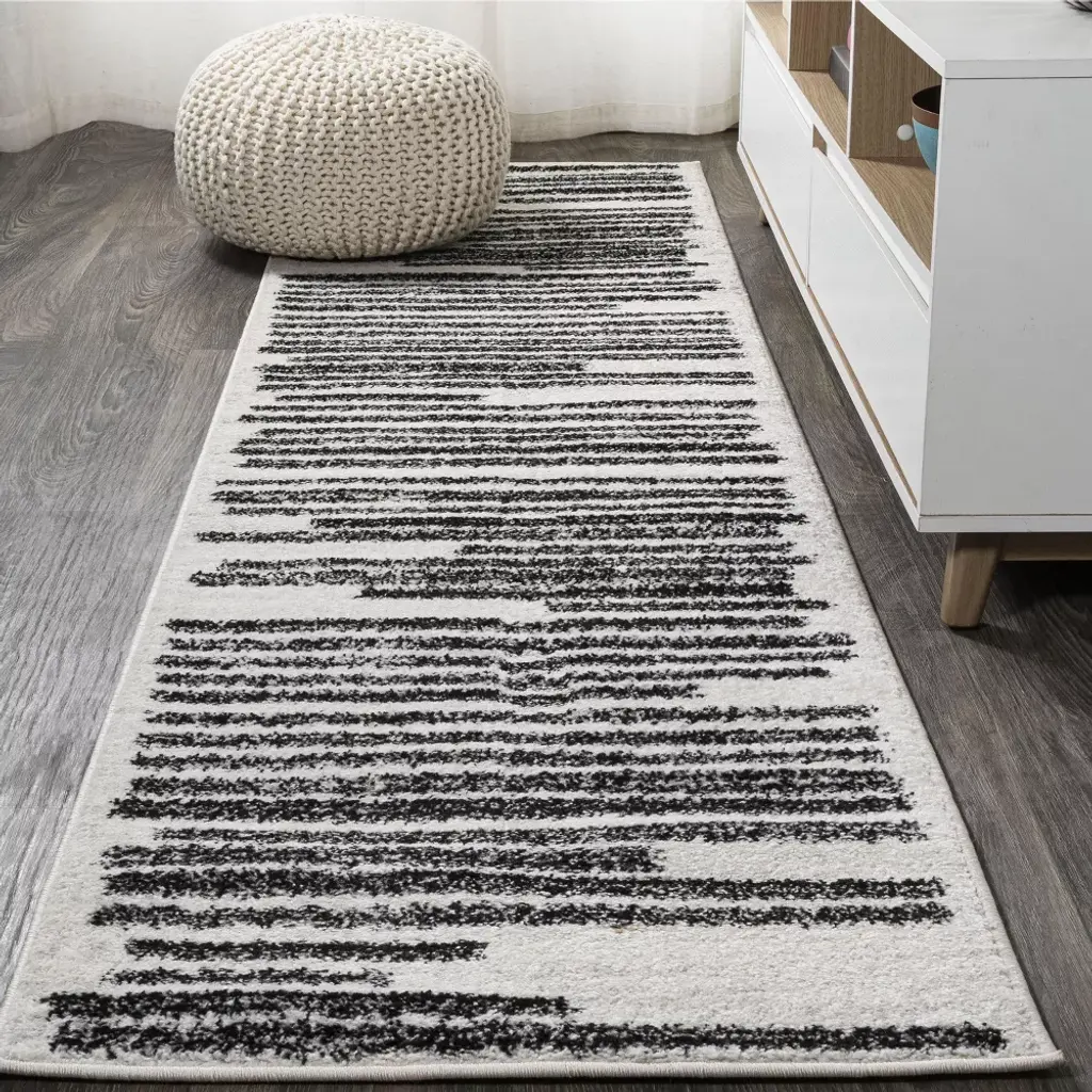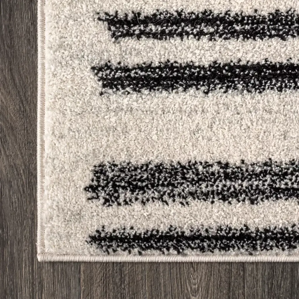 Inspired by vintage Moroccan rugs, our modern striped rug is power-loomed with a short pile. The offset stripe and bar pattern is woven in black on an ivory background; the mingled threads recall traditional handwoven rugs. Add some mid-century style to your home with this easy-care rug.
