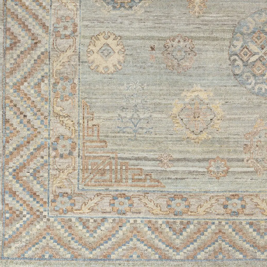 The Khotan Collection showcases traditional inspired designs that exemplify timeless styles of elegance, comfort, and sophistication. With their hand knotted construction, these rugs provide a durability that can not be found in other handmade constructions, and boasts the ability to be thoroughly cleaned as it contains no chemicals that react to water, such as glue. Made with Wool in India, and has Low Pile. Spot Clean Only, One Year Limited Warranty.