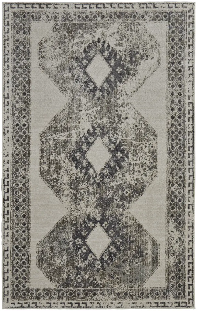 Power loomed in a polypropylene and polyester blend, this collection showcases an on-trend distressed finish. The poly-blend is naturally stain and fade resistant while also being water resistant as well which weathers well if you have pets or host frequently. With classic colors of beige, ivory, and accents of black and grey, this rug is extremely versatile.