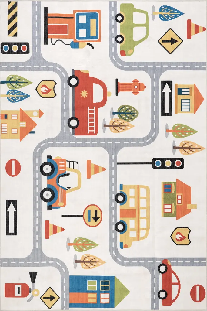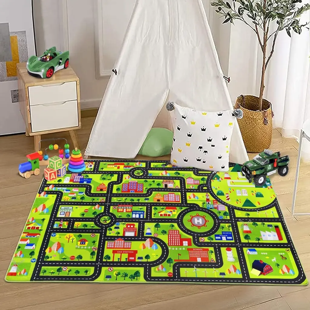Ideal for the home with its versatile design and efficient finishing, this vibrant children's rug displays trees, buildings and toy car paths for a fun and interactive play experience that helps children learn patterns and colors for physical and intellectual development, and the flat-weave base and TPR non-slip backing ensures a safe, durable and easy-to-maintain surface for chairs and door slides. This children's rug is a versatile decorative piece, perfect for home, living room, bathroom, nursery or baby crawling mats, not only a stylish accent for sofas, floors or chairs, but also ideal for nurseries, classrooms, preschools and daycare centers to ensure long-term use. Made of 100% premium polyester, soft foam and non-slip backing, it is gentle and skin-friendly for children and babies, and the high-quality printing is fade-resistant to ensure that it stands up to daily wear and tear while maintaining its vibrant appearance. This children's rug is easy to care for - it can be vacuumed, hand washed or machine washed, machine wash using a laundry mesh bag, cold water and mild detergent, tumble dry low and avoid bleach to maintain quality. The super soft, comfortable and durable surface makes this road traffic play rug the perfect gift for birthdays, Christmas, Children's Day and other holidays, suitable for a variety of surfaces such as tile, wood, ceramic and marble, providing endless fun for toddlers and children. Whether it's the functional design or the aesthetic presentation, this rug offers you both efficiency and flexibility, making it ideal for everyday life.