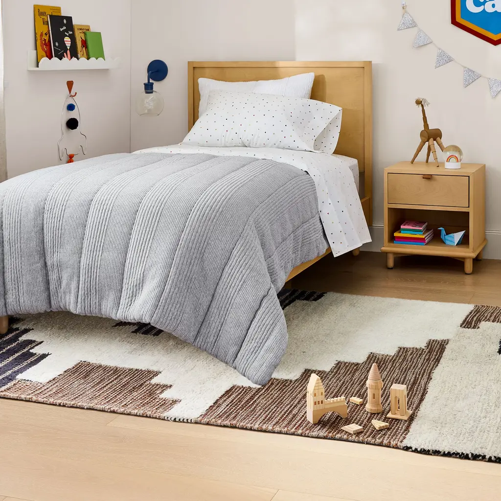 Designed for kids' bedrooms to grow with their personality & style. Made with durable fibers that are versatile for any room. 100% wool is highly durable and soft underfoot. The cotton backing is sustainably sourced.