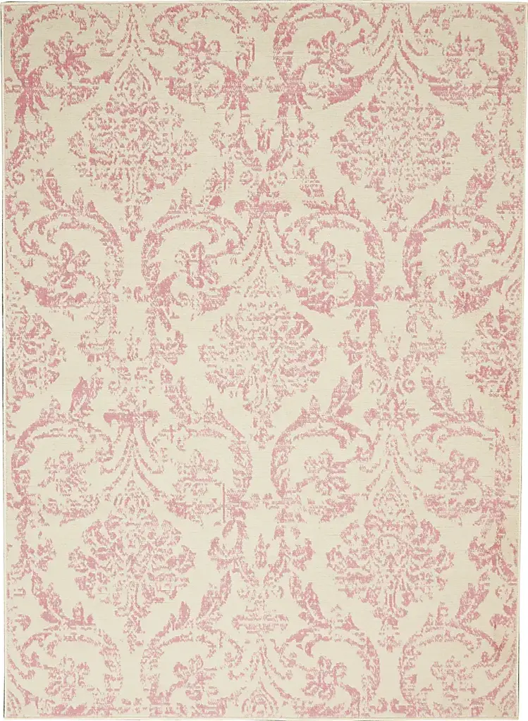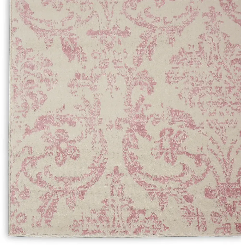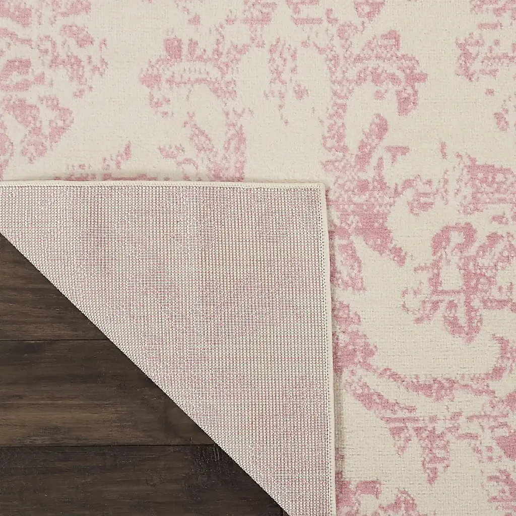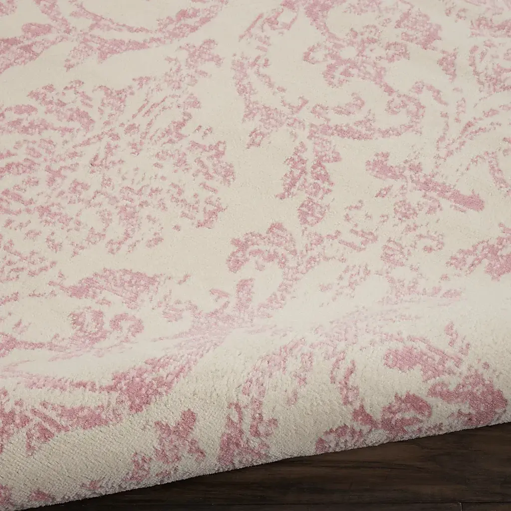 Inspired by ornate damask flourishes, the Little Princess Decor rug brings a graceful charm to her room. Soft pink patterns unfurl across an ivory field like blossoms in spring, creating a look that feels delicate, inviting and full of imagination. Power-loomed in Turkey, it's made with easy-care fibers that resist wear and simplify cleaning. The low-pile construction keeps it sleek and versatile, while the cut-pile finish provides a soft, comfortable feel underfoot. Its borderless design adds a modern touch, and the medium pile height offers just the right amount of plushness. 100% Polypropylene