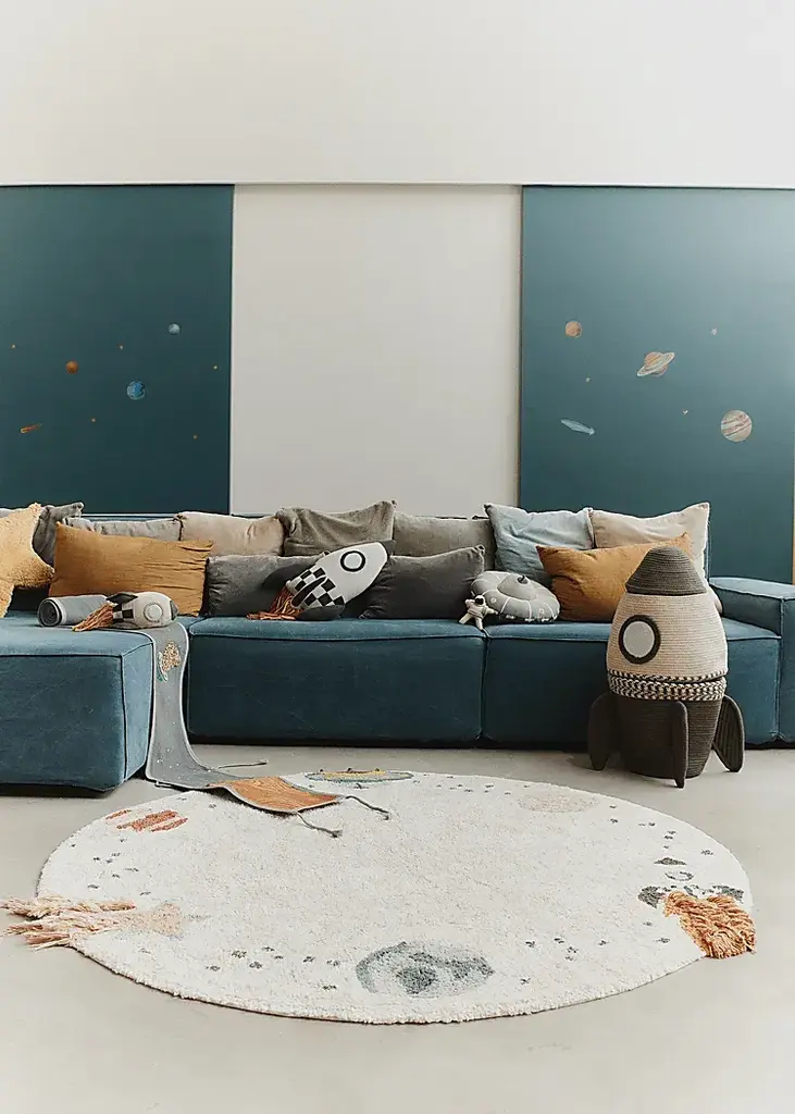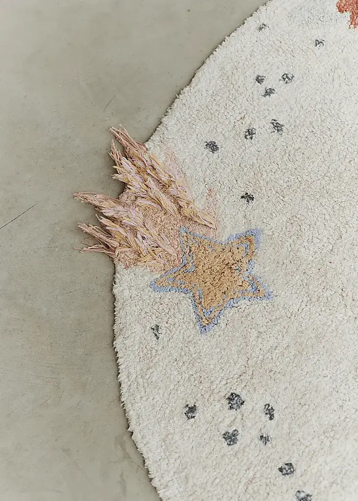 Transform your child's room into a space adventure with this interstellar natural canvas rug. Featuring charming designs around the border of three planets, a rocket, a shooting star, and a UFO, this rug is perfect for young explorers and aspiring astronauts. A piece of art to take a walk in the immense universe. Your room will arrive to new universes.
