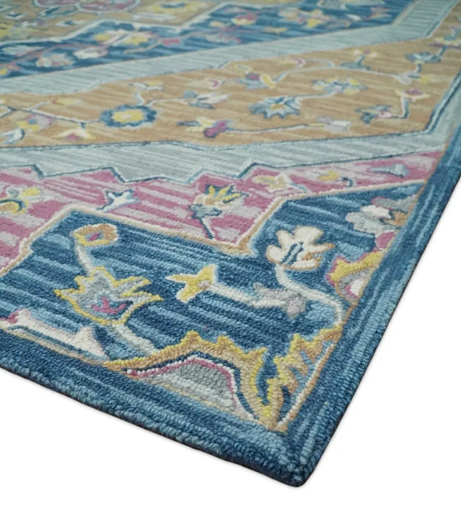 This Hand-Tufted Area Rug has been made with fine wool. The Heriz-inspired medallion design is shaded Blue and Pink blended with multi-color giving a modern and elegant look to your room. The loop weaving of the rug adds a textural element to your interiors.Hand-Hooked rugs are woven using a specialized mechanical tufting gun. The rugs typically have a loop pile. Hand-Tufted 5x8 and 8x10 are ready to ship, all other sizes are made to order in 30 - 45 days Made with wool Color: Blue and Pink Contact us for custom sizes USERS GUIDE Avoid prolonged moisture Vacuum regularly and/or shake to remove dust Do not pull any loose threads. Use scissors to simply cut the ends Blot spills immediately with a white cloth. Harsh chemicals may damage or fade the rug Use rug protectors under heavy furniture