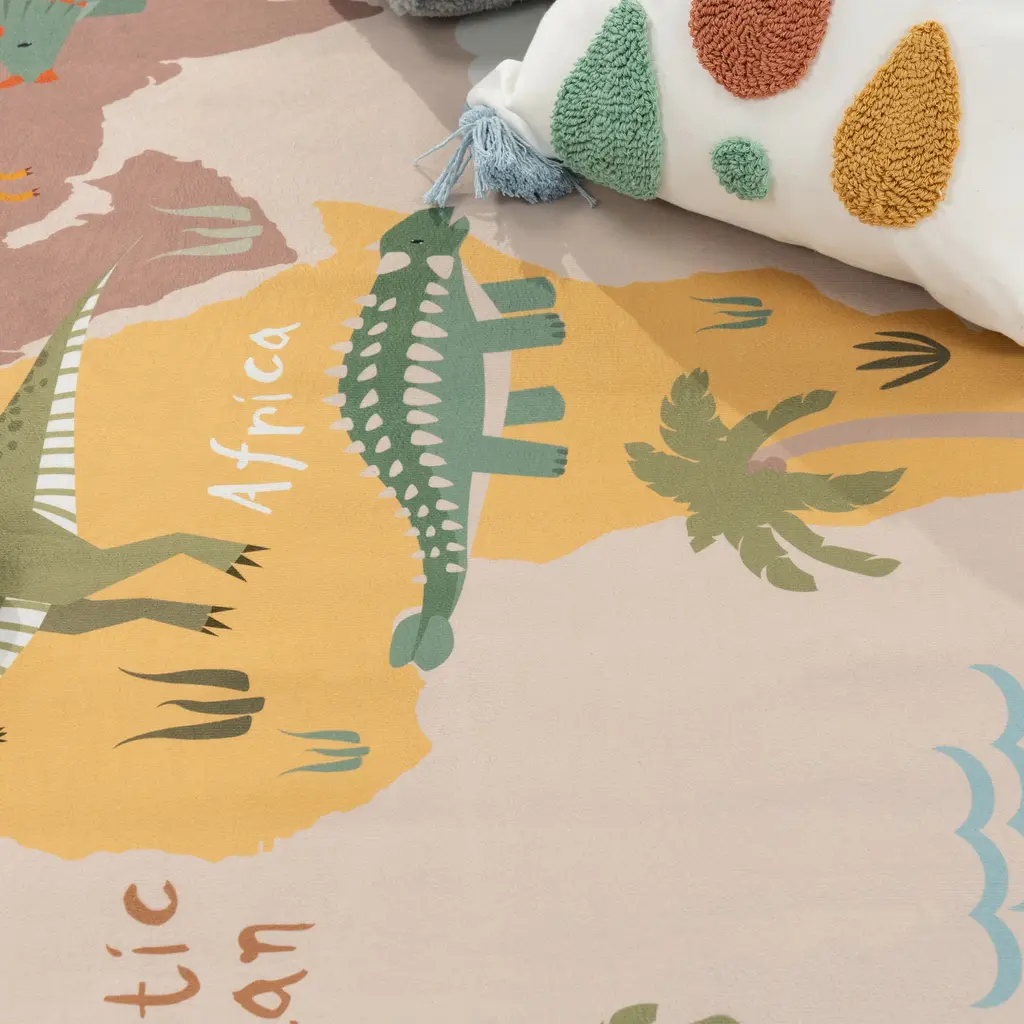 Our Mesozoic-themed rugs are a prehistoric playground for budding paleontologists. Children will be enthralled for hours, discovering dinosaurs and marveling at the ancient world beneath their feet. Designed to educate as well as entertain, these rugs are where young dino enthusiasts begin their journey. Set in a palette of earthy beige tones, these rugs are a captivating addition to any child's room, offering both a stunning array of dinosaur details and a global map illustrating the prehistoric distribution of these majestic creatures. Beyond their visual appeal, these short pile rugs provide a cozy touch and a wealth of educational value. They're also incredibly easy to clean and crafted from durable synthetic fibers for enduring enjoyment. Our commitment to your child's safety is reflected in the STANDARD 100 by OEKO-TEX certification, ensuring a playtime environment that's as safe as it is stimulating, free from harmful substances.