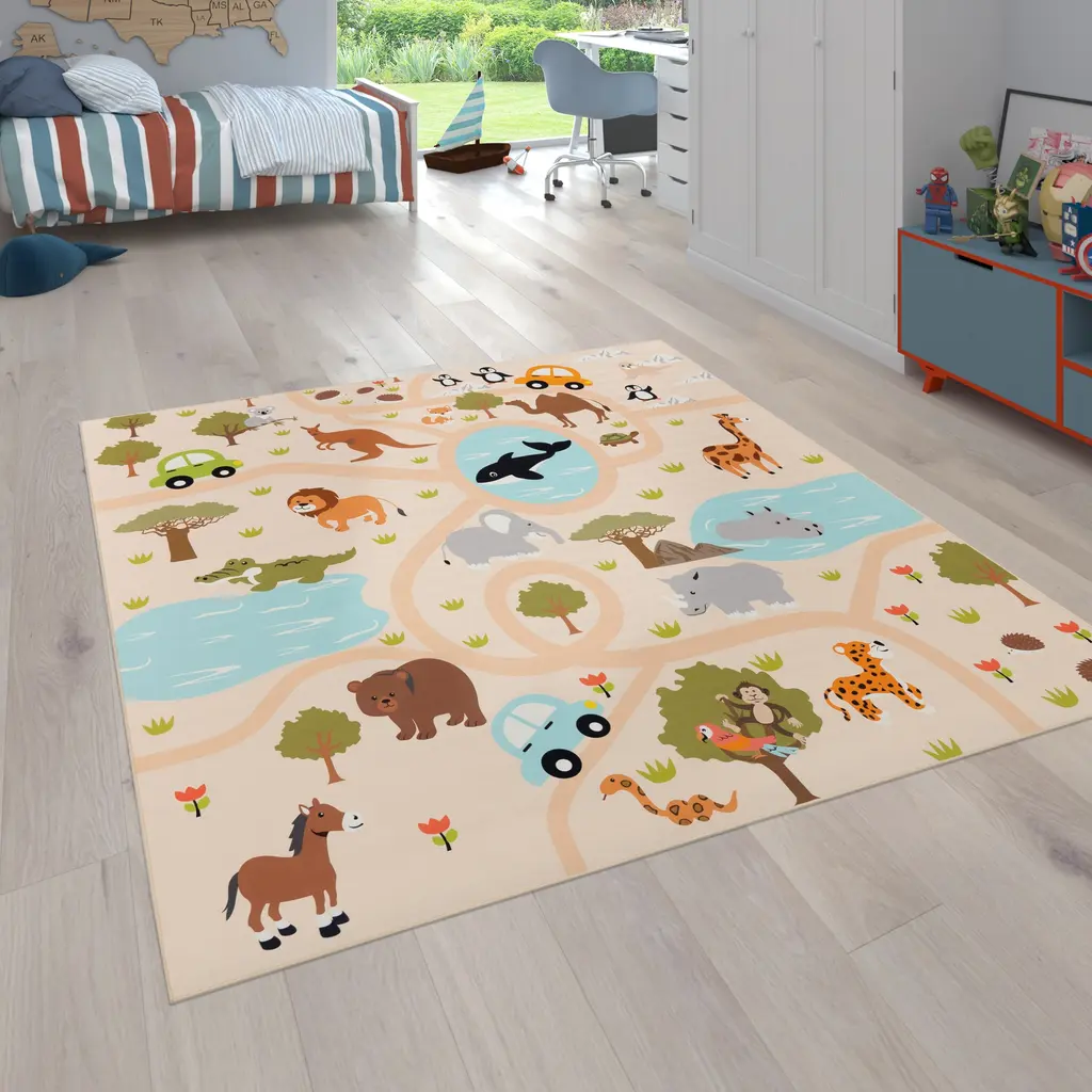 Kids Rug Wild Animals Play Mat In Beige Multicolor - 3'11" X 5'3"