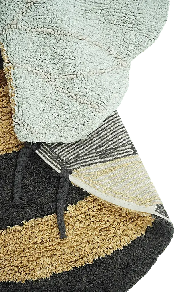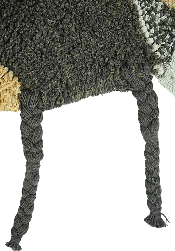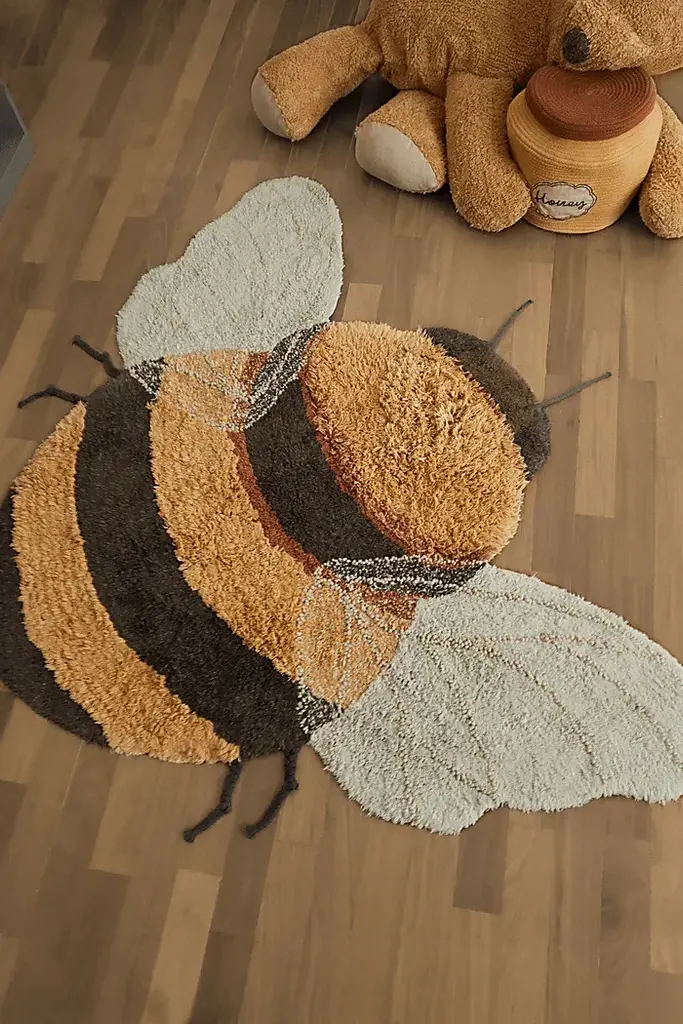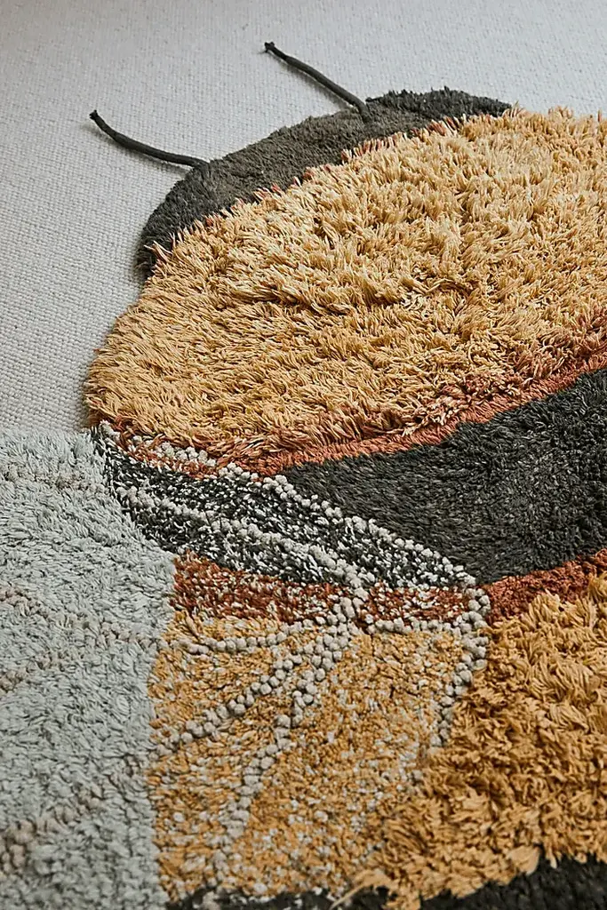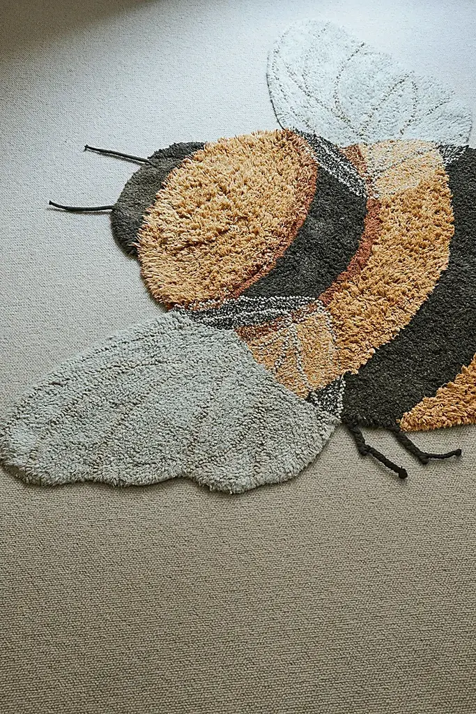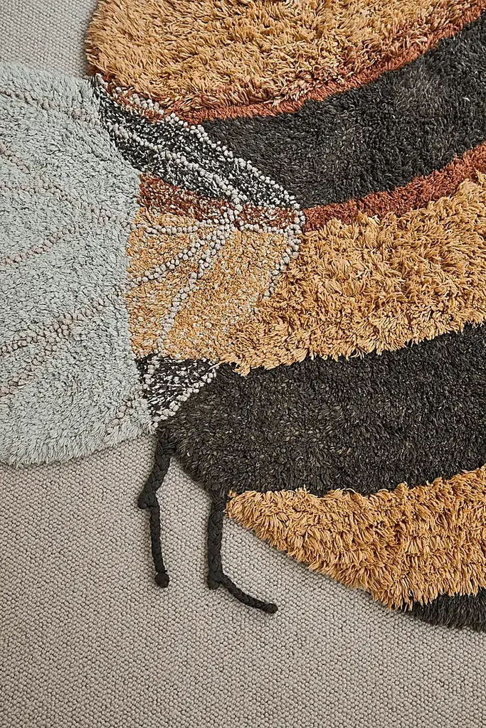 This bumblebee-shaped rug brings playful charm to any space, with honey and dark grey stripes and fluffy textures along its body. Its light blue wings are delicately handcrafted to create a soft, transparent effect that captures the essence of gentle flight. Dark gray braided legs and antennae add whimsical detail and tactile dimension. Machine washable and full of character, it's a buzzing burst of joy for eco-loving homes.