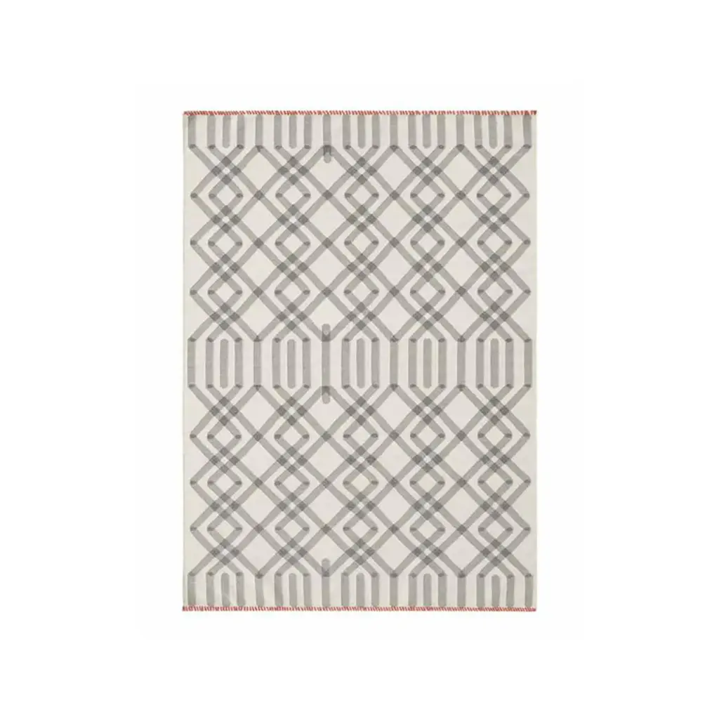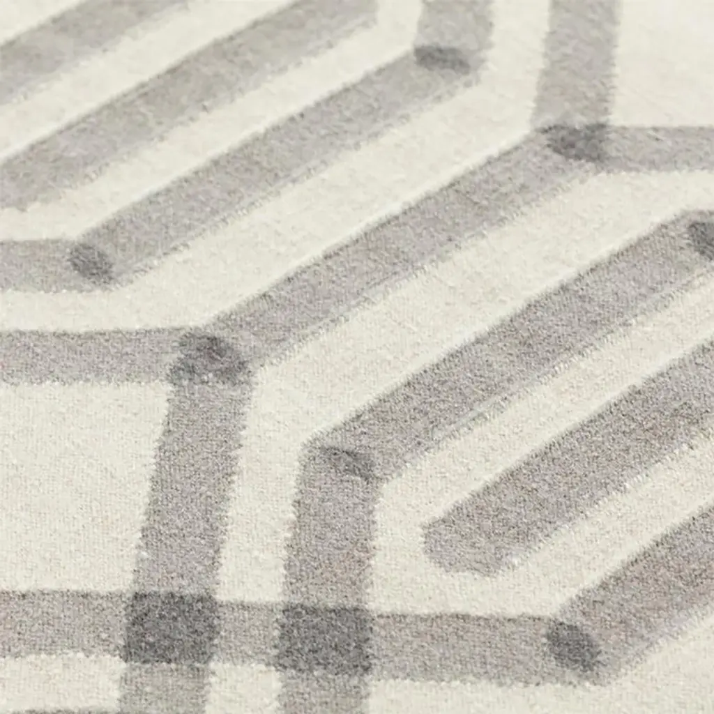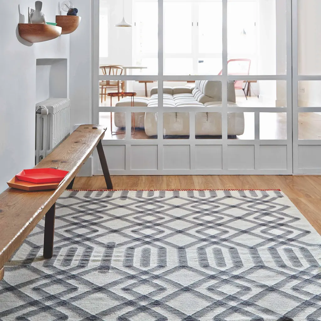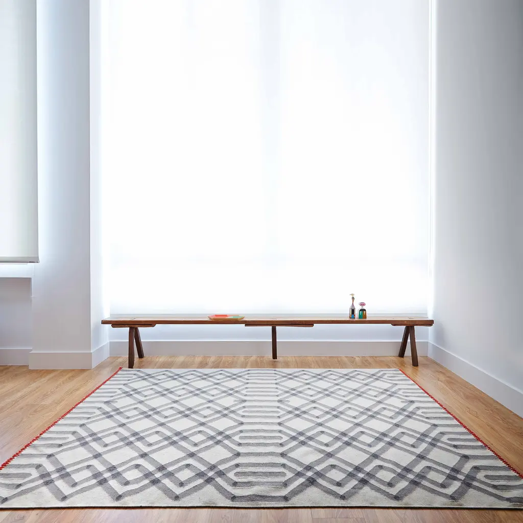 Recalling the desert landscape of the Bedouins DUNA is firmly part of the Mediterranean family of cultures united by the sun and its intense light, a light that fades, that fascinates and that shimmers in the heat. A geometric motif that is dream like, monochromatic and liquid. DUNA is part of the KILIM collection of rugs, and inspired by the nomadic way of life and the use of rugs to construct mobile living spaces. The idea came about from the combination and superimpositions of layers similar to the ones that are used when creating a watercolor painting. So that different grades of transparencies are mixed together and form a monochromatic grid that almost appears to be three dimensional. Features