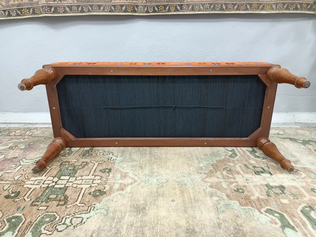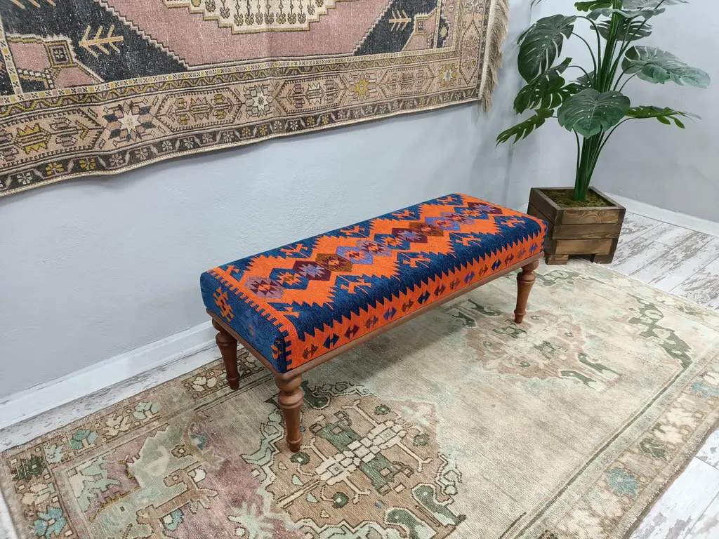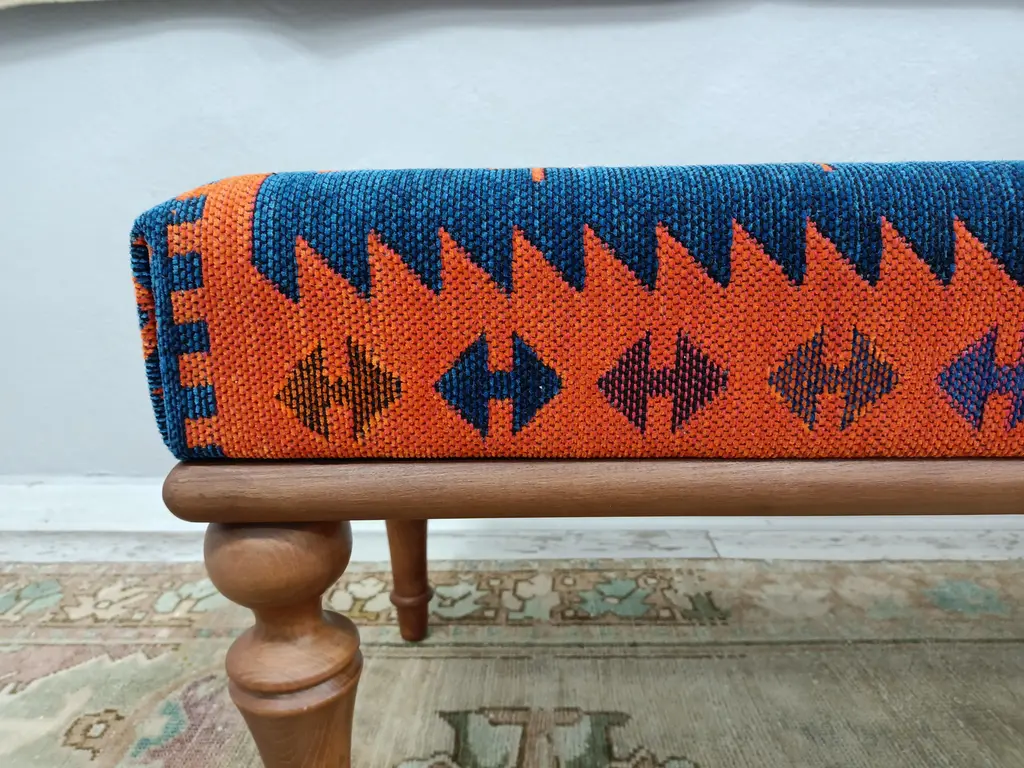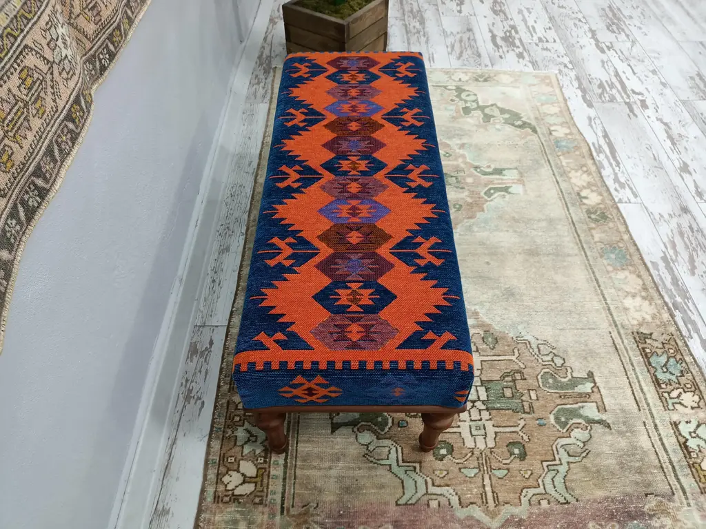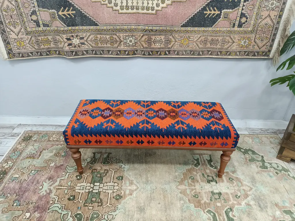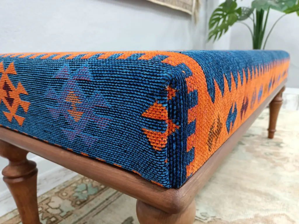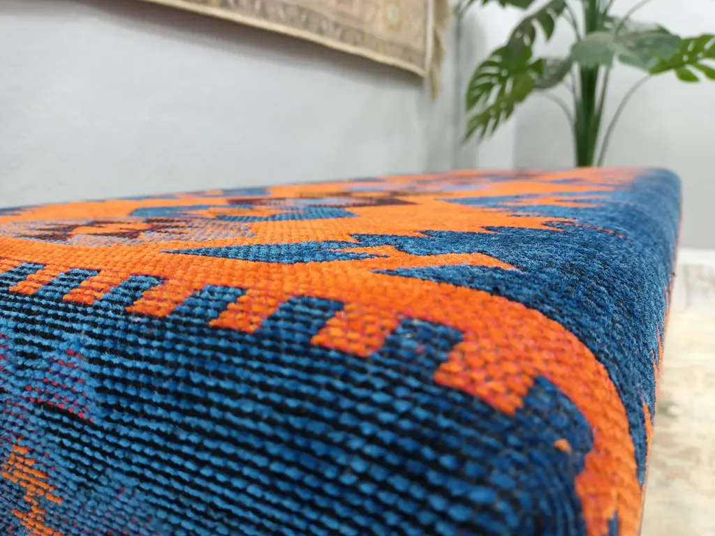 SIZE: 18X18X48 Inches ( with legs ) - 45x45x120 cm TYPE: Handmade Ottoman Bench CONDITION: is good. CONSTRUCT: It will come with disassemble legs, you can easily put together ottoman top table ( body ) with legs. There is disassembled legs with screw. Set up time around 30 seconds. Please use soft floor to set up. MATERIALS: Rug, Hornbeam Body, Textile and zipper backside, poplar wood inside CLEANING: Professionally Cleaned and Disinfected
