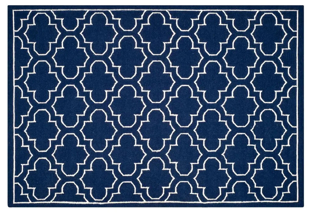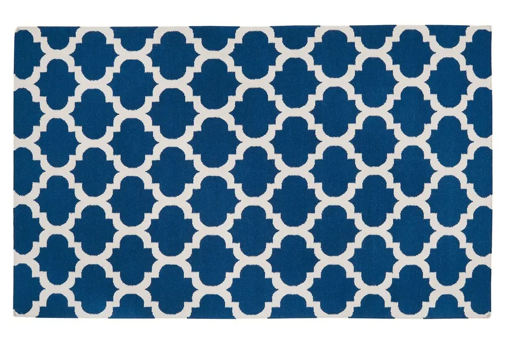 Handwoven of wool, this dhurrie updates a classic Moroccan-inspired design with a high-contrast palette in navy and ivory. We recommend a rug pad to extend the life of your rug and keep it securely in place.