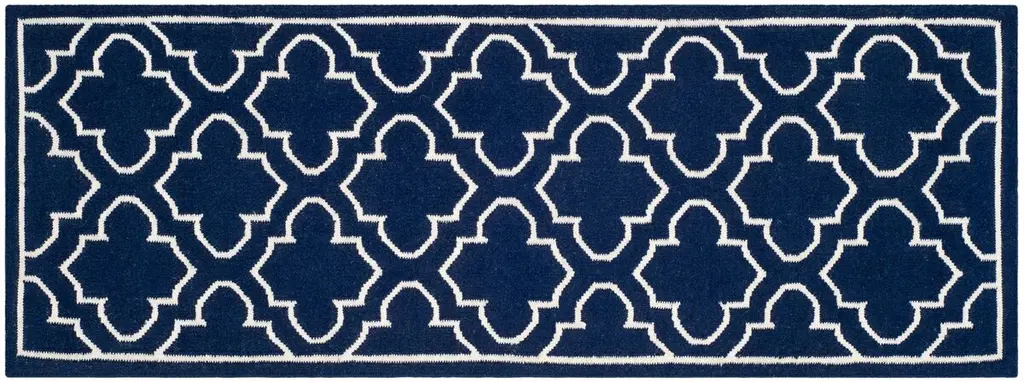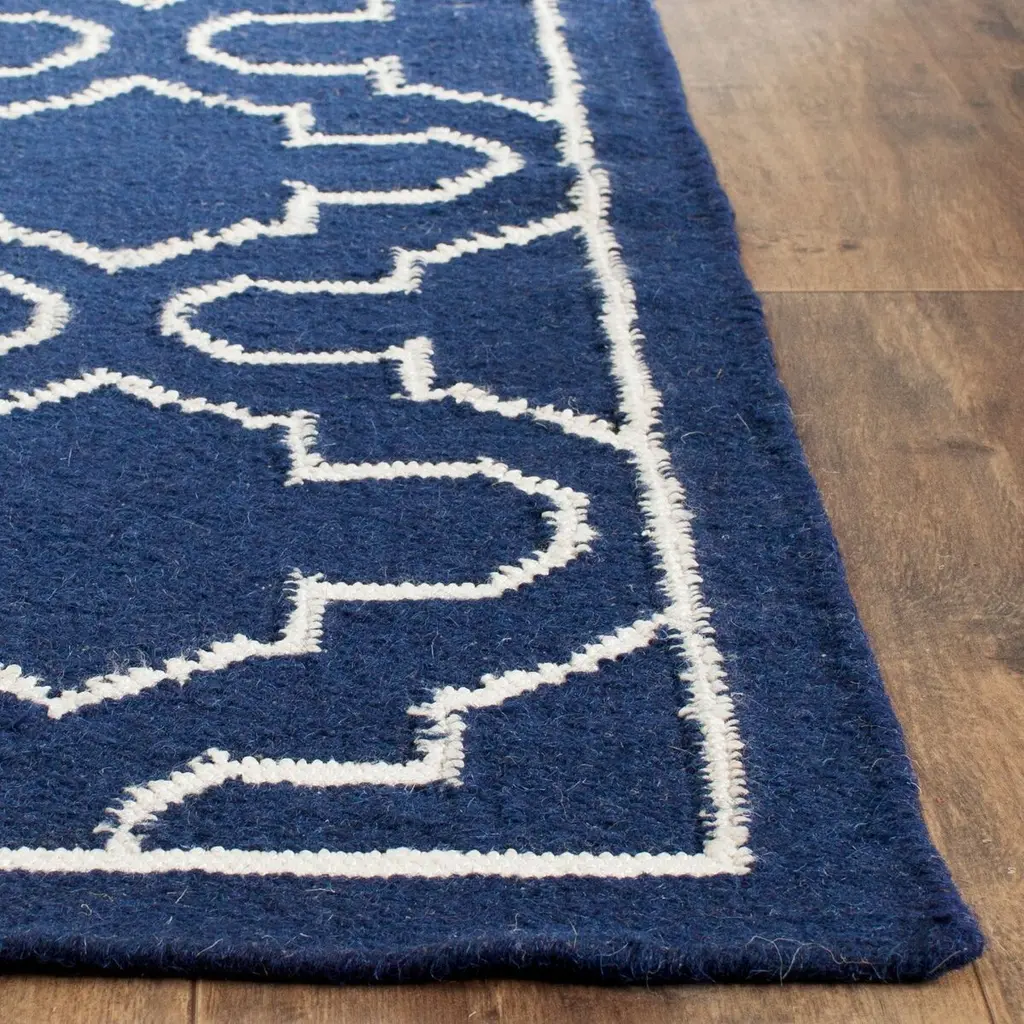 Handwoven of wool, this dhurrie updates a classic Moroccan-inspired design with a high-contrast palette in navy and ivory. We recommend a rug pad to extend the life of your rug and keep it securely in place.