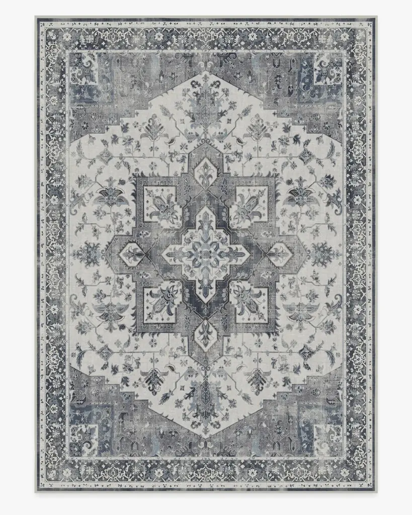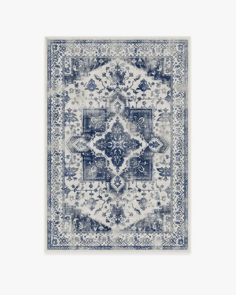 A traditional style with a distressed finish. Reminiscent of delft pottery, our Kira Delt Blue Rug features a striking combo of saturated navy and jewel blue tones with off-white. Water-resistant, stain-resistant, and machine-washable.