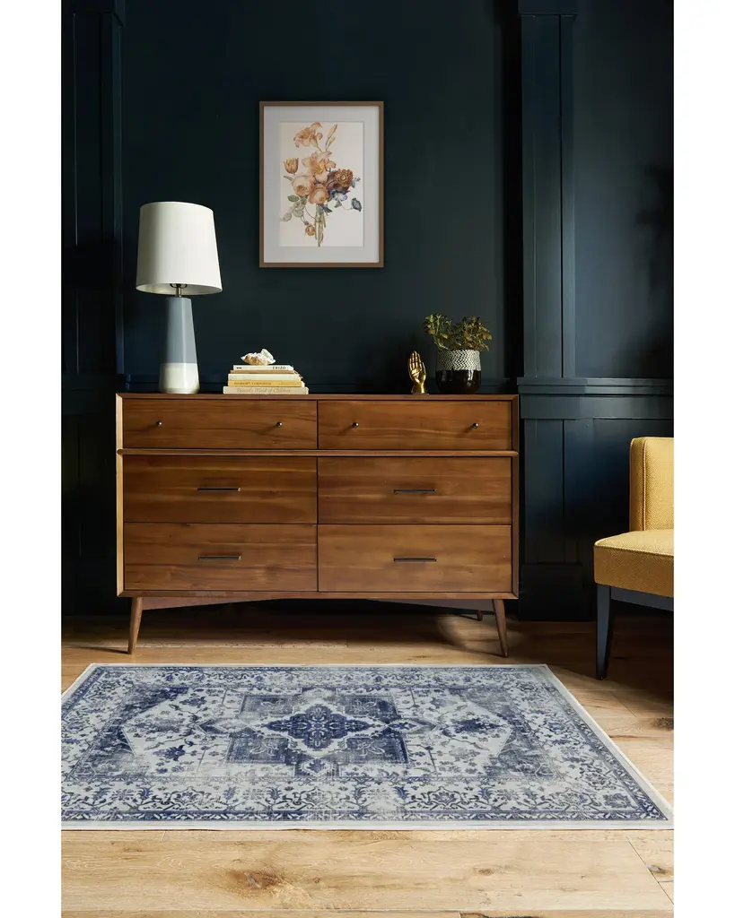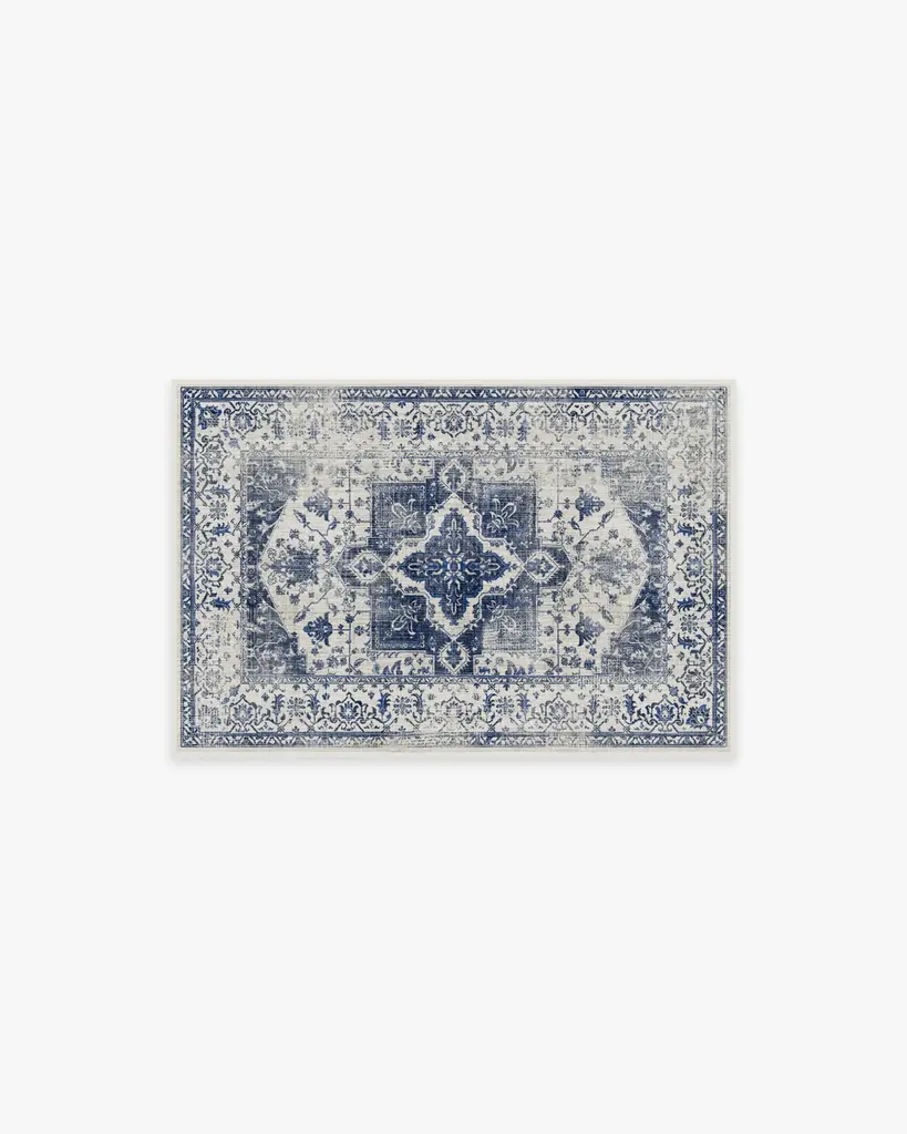 A traditional style with a distressed finish. Reminiscent of delft pottery, our Kira Delt Blue Rug features a striking combo of saturated navy and jewel blue tones with off-white. Water-resistant, stain-resistant, and machine-washable.