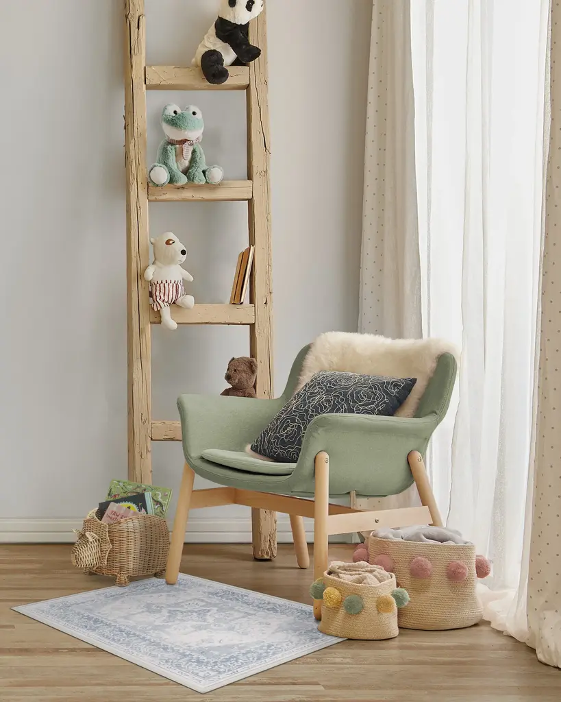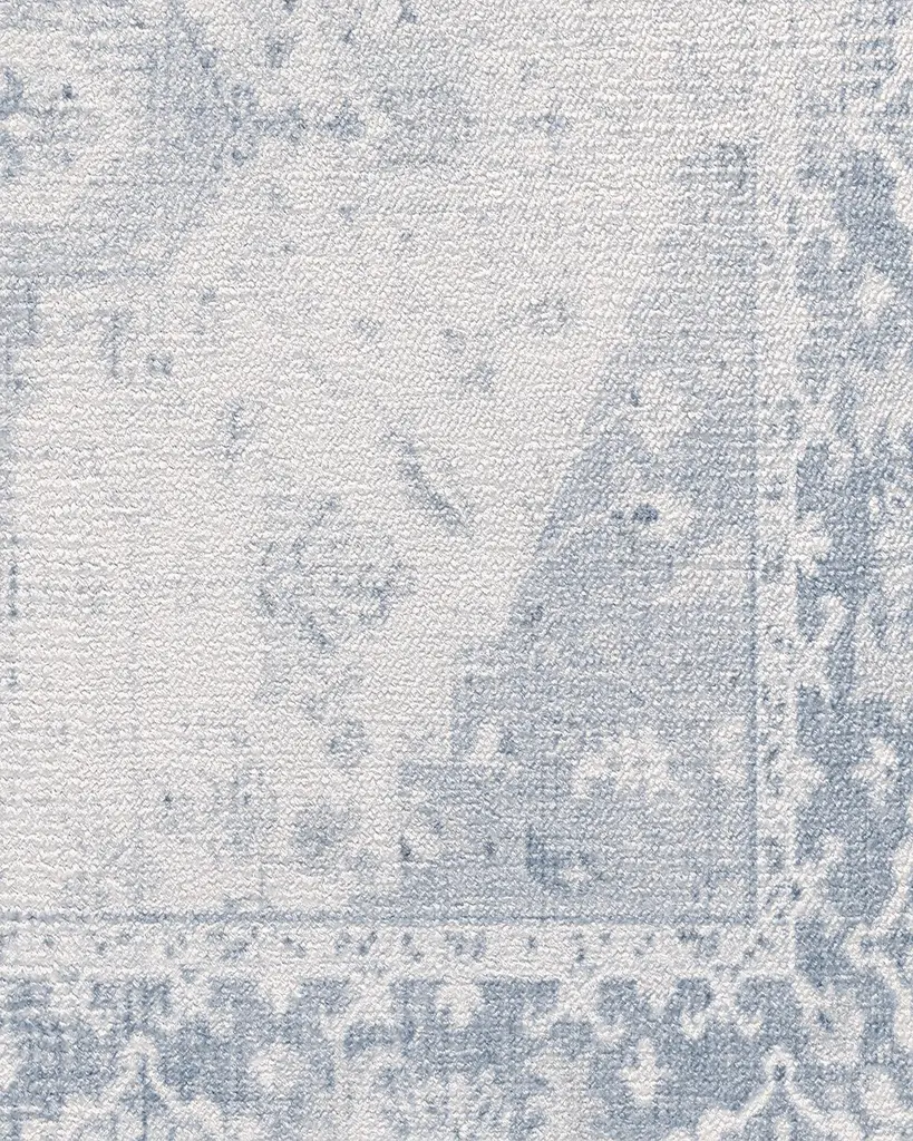 Clear skies ahead. Our antique-style Kira Soft Blue Rug offers a mellow range of soft blue and grey tones with pops of off-white and grey accents. Adorned with a floral and geometric motif with an ornate border, this Persian-inspired rug looks stunning against a mascarpone white background. Water-resistant, stain-resistant, and machine-washable.