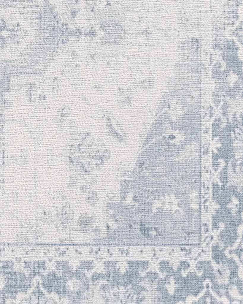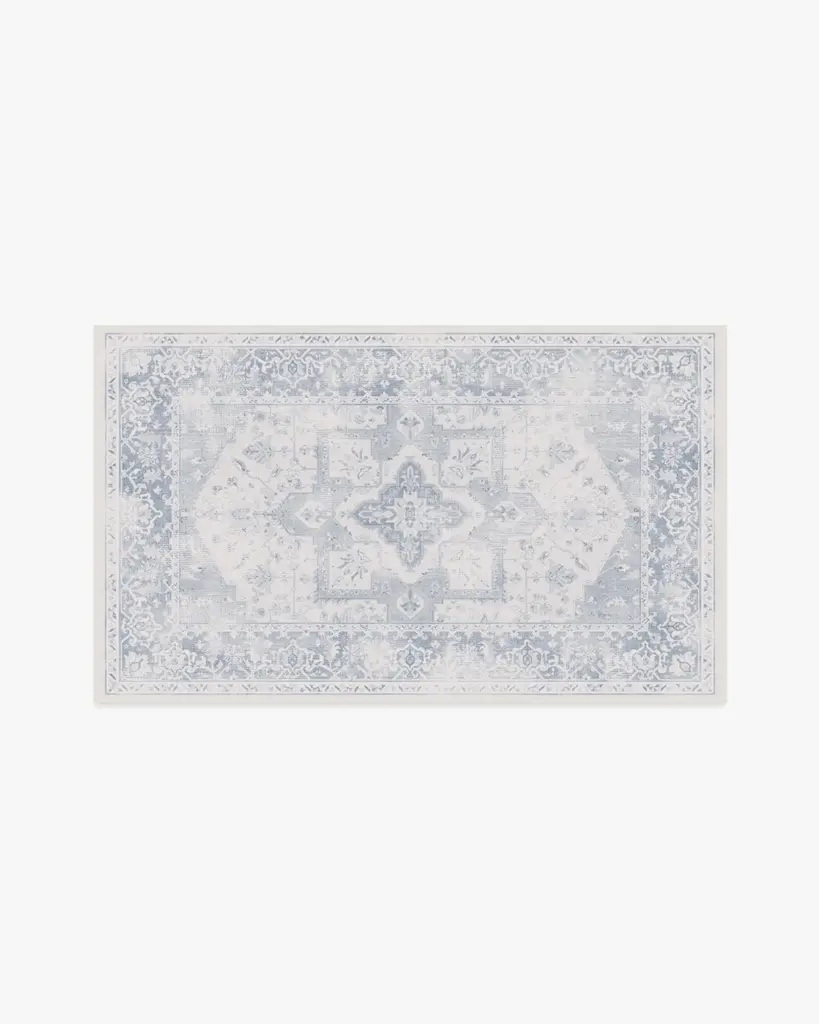 Clear skies ahead. Our antique-style Kira Soft Blue Rug offers a mellow range of soft blue and grey tones with pops of off-white and grey accents. Adorned with a floral and geometric motif with an ornate border, this Persian-inspired rug looks stunning against a mascarpone white background. Water-resistant, stain-resistant, and machine-washable.