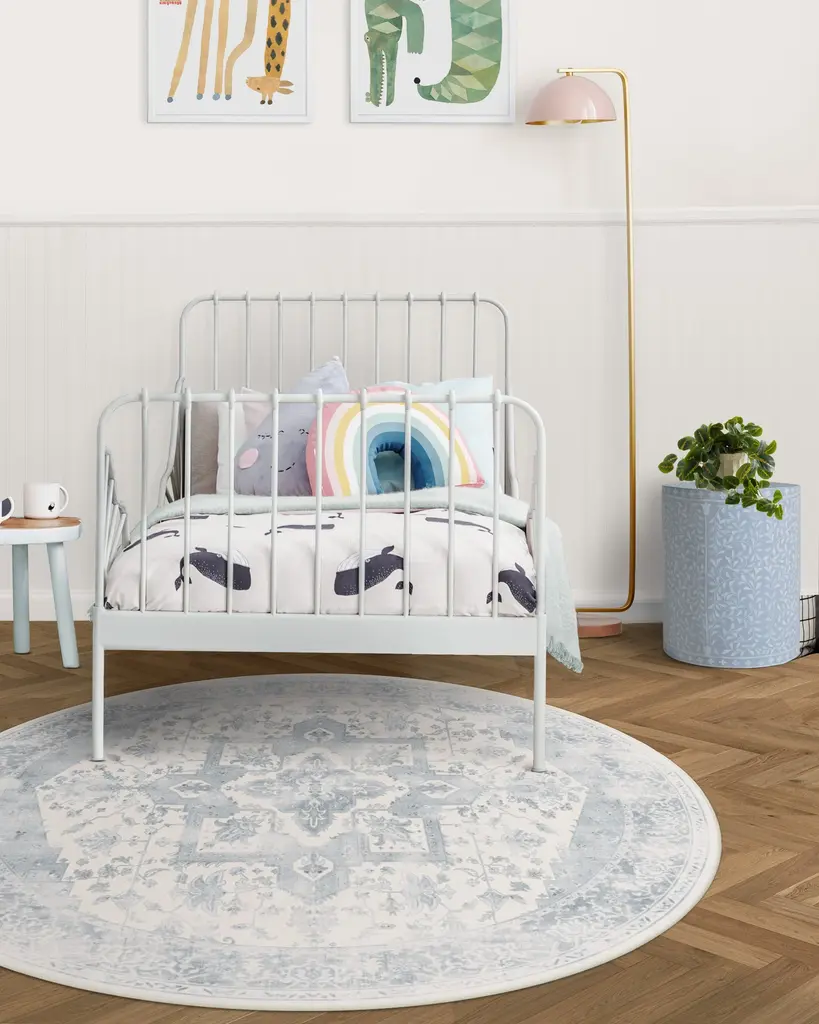 Clear skies ahead. Our antique-style Kira Soft Blue Rug offers a mellow range of soft blue and grey tones with pops of off-white and grey accents. Adorned with a floral and geometric motif with an ornate border, this Persian-inspired rug looks stunning against a mascarpone white background. Water-resistant, stain-resistant, and machine-washable.