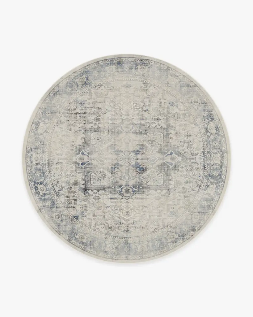 Clear skies ahead. Our antique-style Kira Soft Blue Rug offers a mellow range of soft blue and grey tones with pops of off-white and grey accents. Adorned with a floral and geometric motif with an ornate border, this Persian-inspired rug looks stunning against a mascarpone white background. Water-resistant, stain-resistant, and machine-washable.
