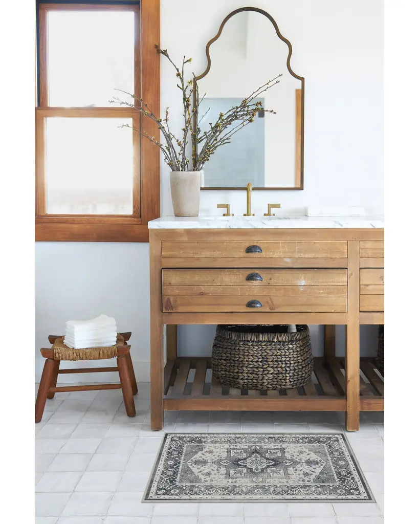 Farmhouse with a vintage twist. This rug features an ornate floral and geometric motif with a center medallion and ornate borders. Its palette of grey shades has pops of navy and jewel blue with a distressed finish. Water-resistant, stain-resistant, and machine-washable.