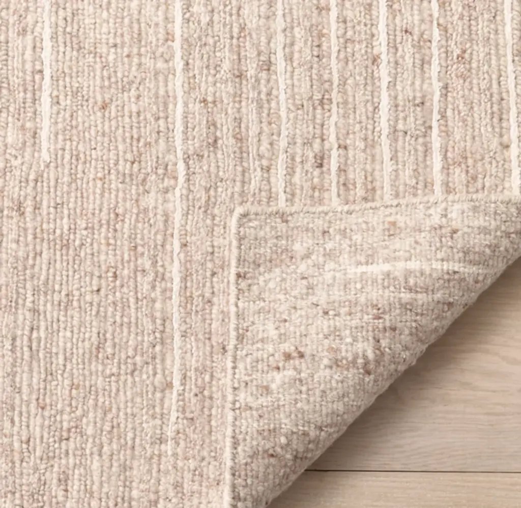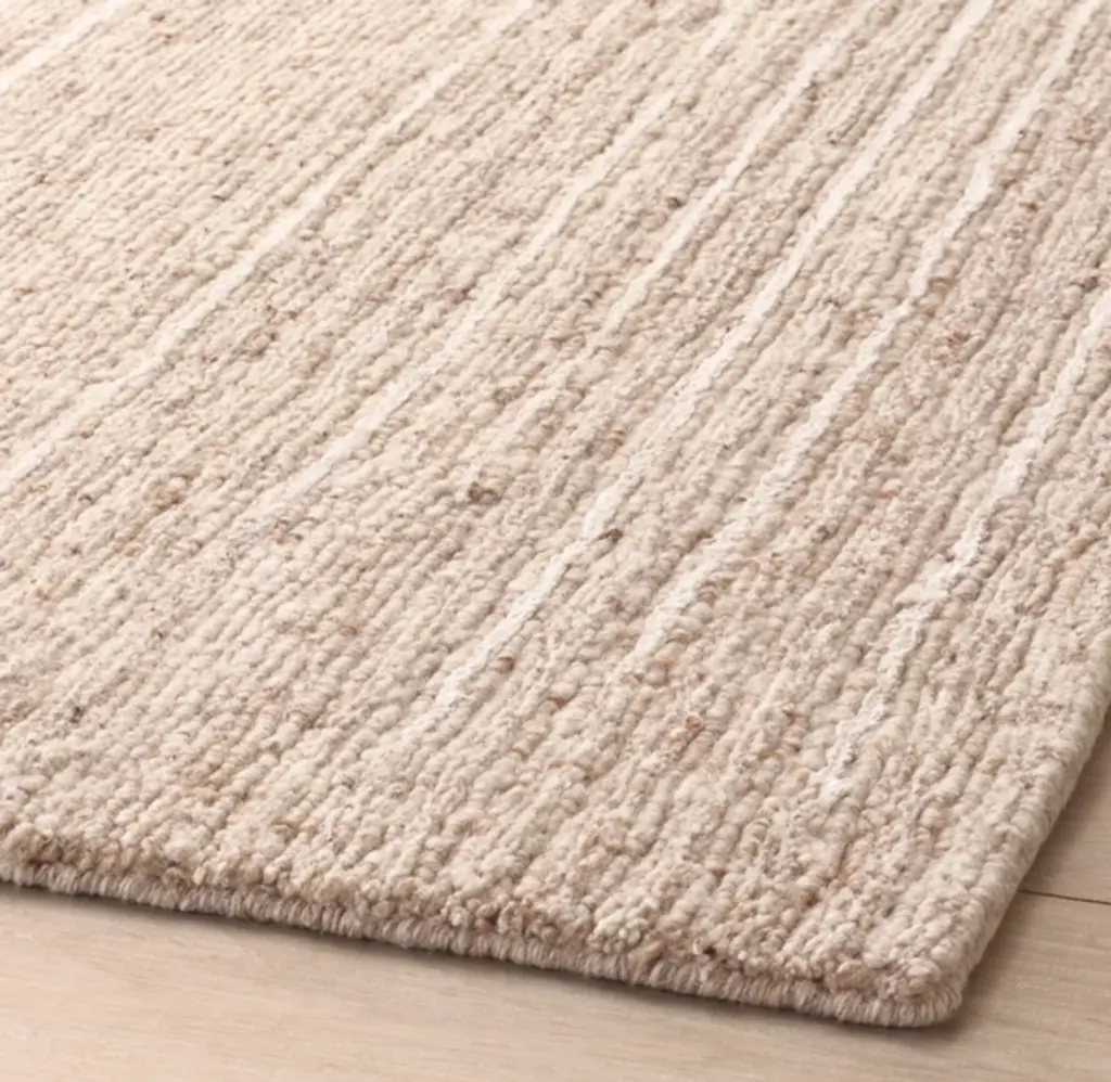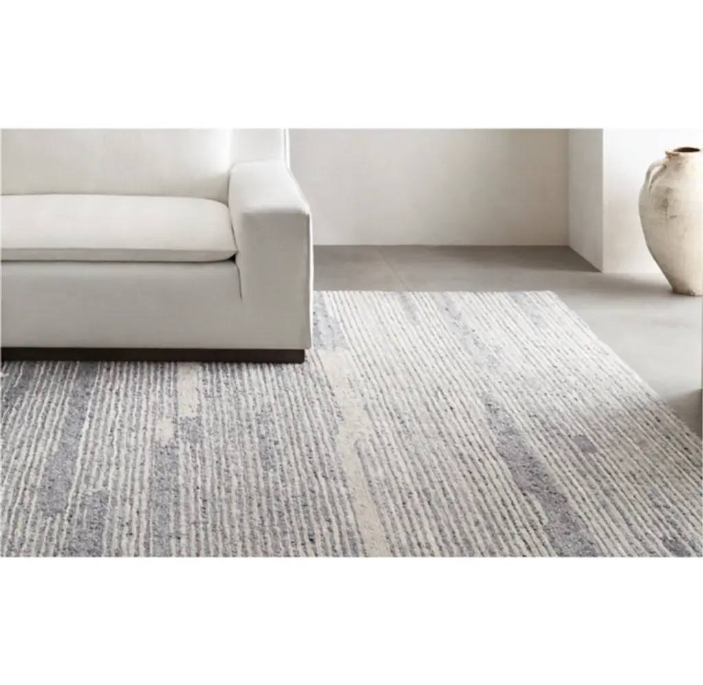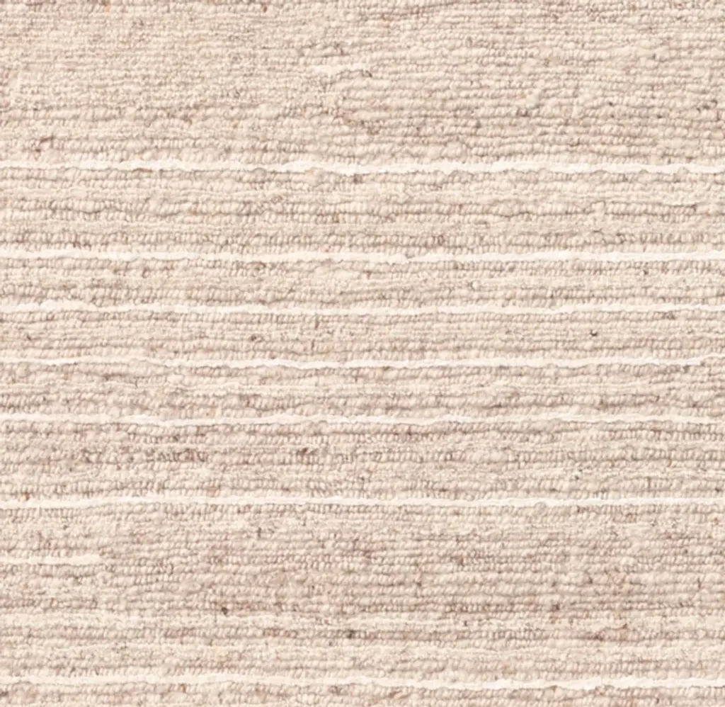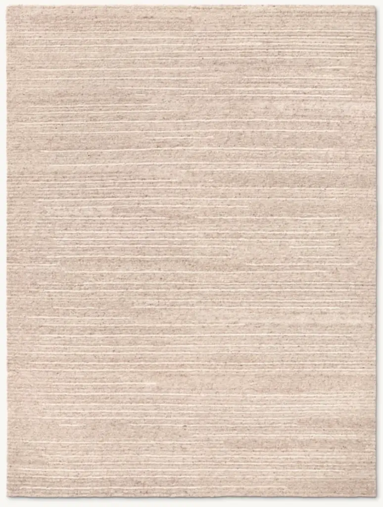 Inspired by an abstract Indian textile pattern, Kiran is softly rendered in undyed New Zealand wool and silk. Tibetan knots impart a raw, textural look, and the mix of matte and lustrous yarns lends a rich patina to the looped, hand-cut pile.