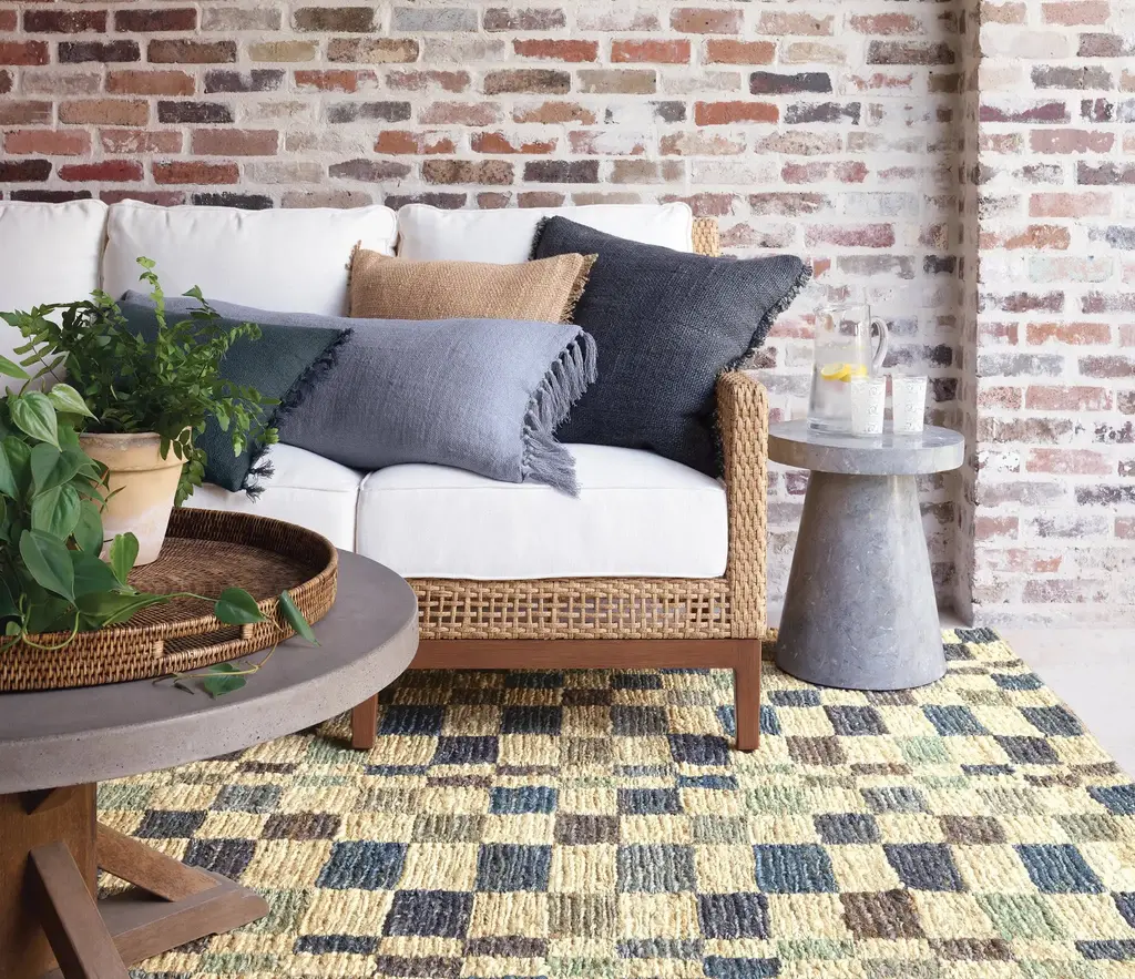 Connect to the earth with the relaxed aesthetic of a foundational rug, embodying a legacy of quality craftsmanship and elegant modernity. Soothing shades of calm, inspired by nature's harmony, form a bold rhythmic geometric composition. Durably woven with sustainable jute in a deeply textured, playful variegated patchwork. Timeless and contemporary, free-spirited and modern, this hard-working beauty is offered in a sophisticated palette of mineral-rich neutrals. Designed for us by Marie Flanigan, an award-winning interior designer, to reflect her signature style of timeless elegance and innovative simplicity.