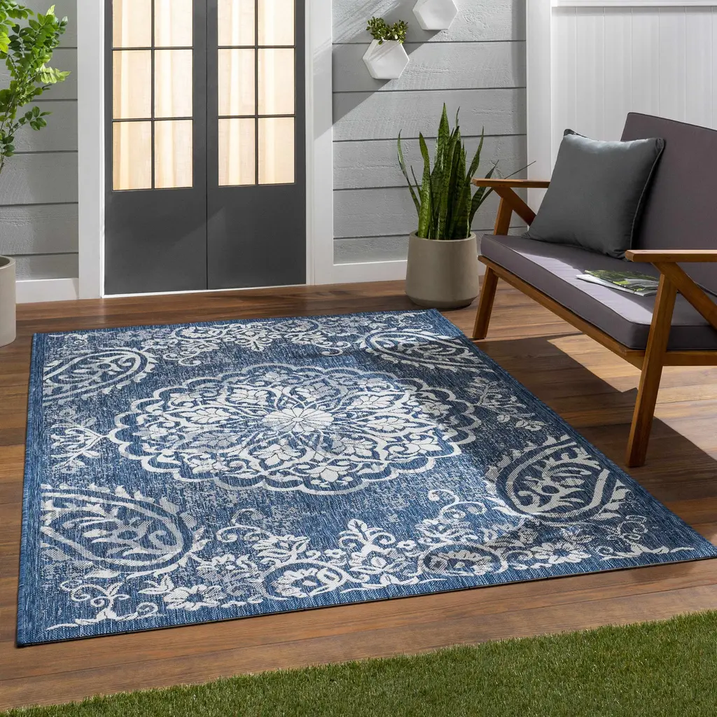 Collection: Kleinton Colors: Cream, Denim, Light Gray, Navy Construction: Machine Woven Material: 100% Polypropylene Pile: No Pile Styles: Traditional Outdoor Safe: Yes Made In: Turkey Thickness: 0.16" Price Range: $$$$$ (Most Affordable)