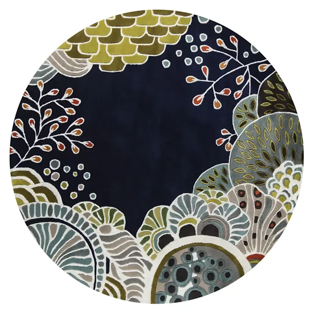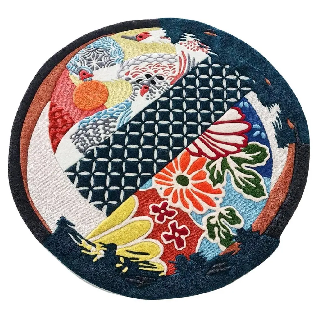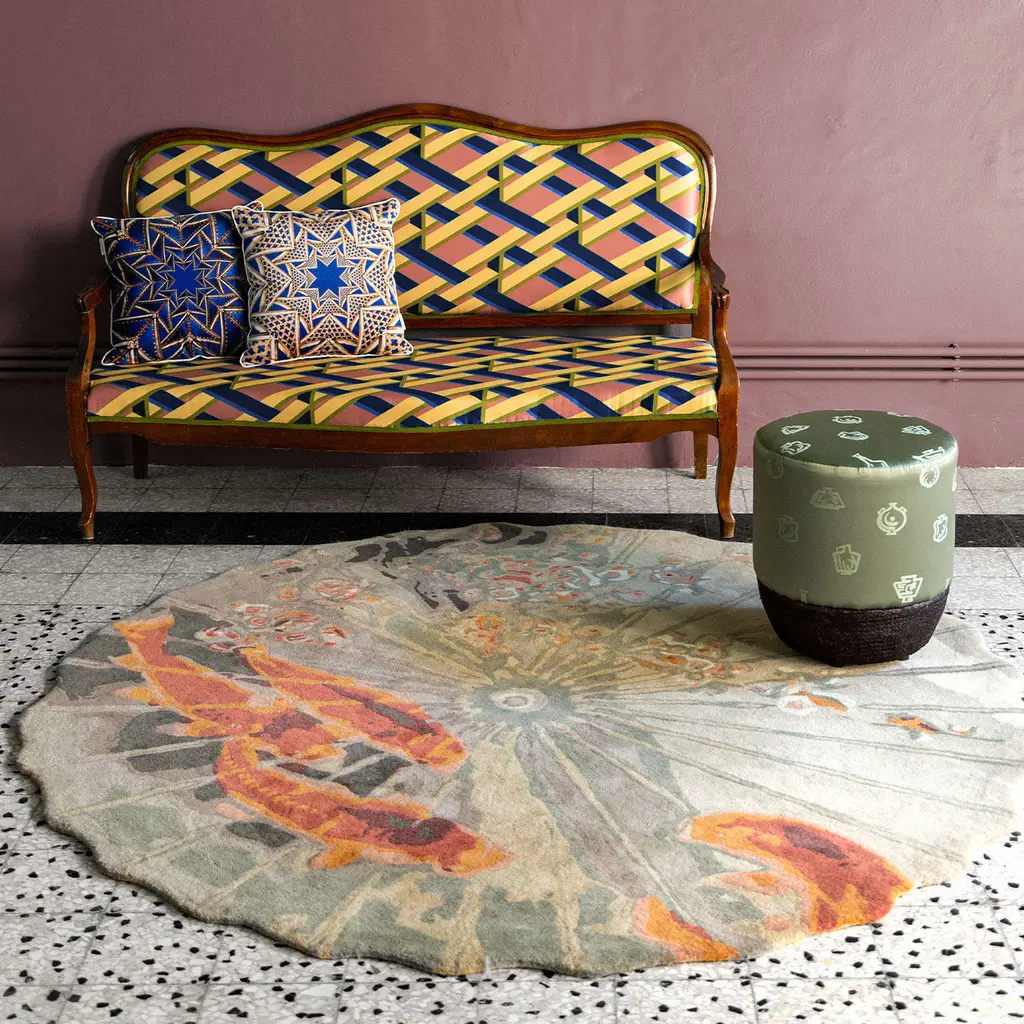 IKE e KOI, in the Japanese language respectively "pond" and "carp" are two pure wool carpets in the shape of old Chinese paper umbrellas made in India by the best artisans. This romantic and iconic object, which in the oniric world represents adaptiveness and luck, leads to a colorful and mysterious world. KOI is a rice paper colored carpet in which a handful of lazy and quite sleepy carps swim in formation.