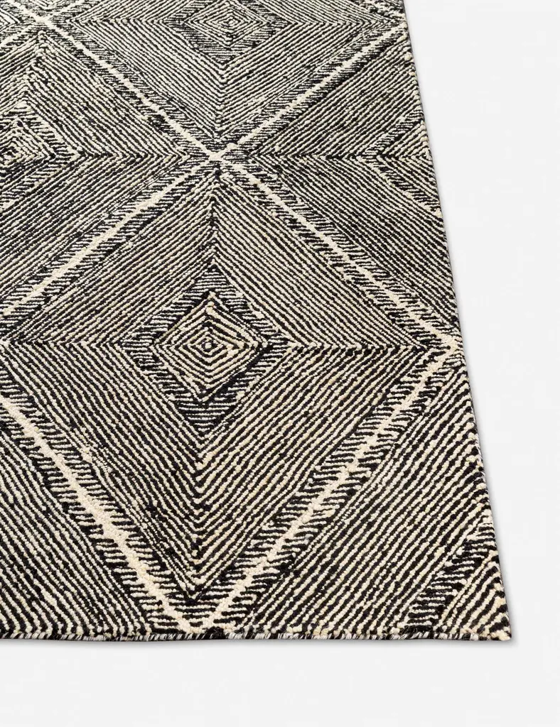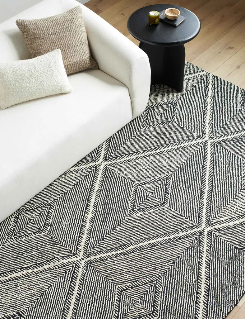 Strike a modern tone with this rug's geometric design. The hand-tufted rug's stripe-on-stripe diamond pattern pops in a high-contrast palette. With its plush woolen pile, it's perfect for sophisticated spaces.