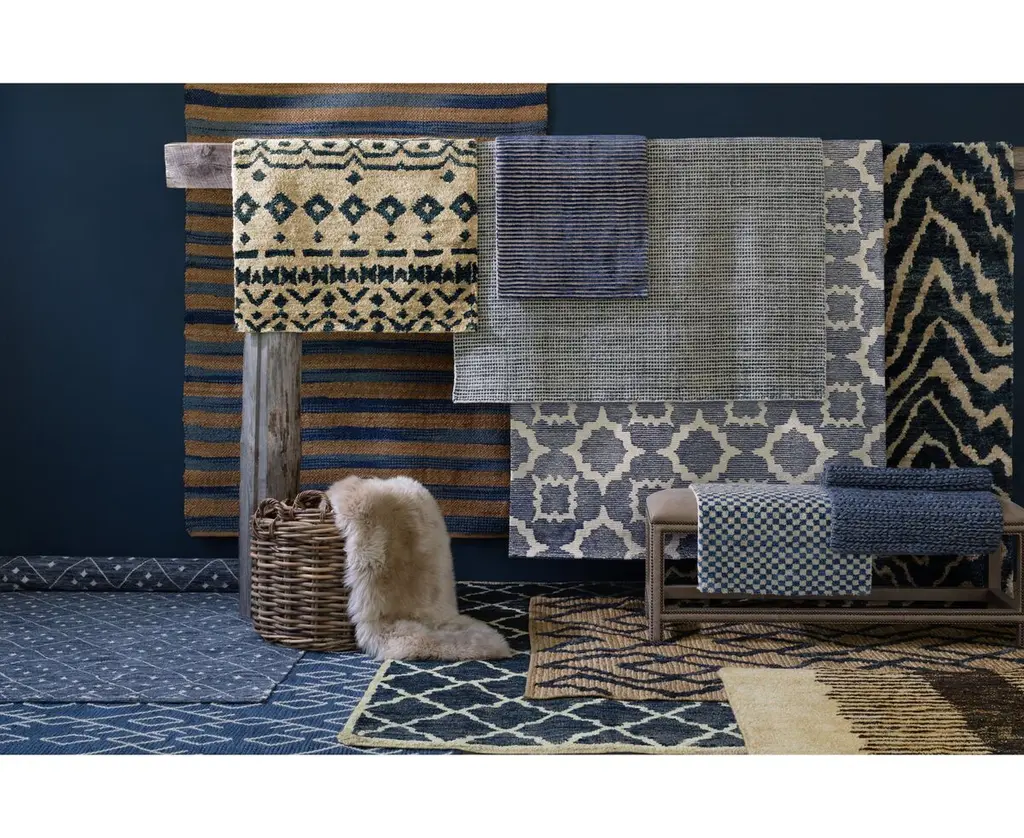 Handwoven using a blend of soft wool and cotton, this flat-weave enlivens any space with its bold geometric design. Oxidized silver thread is woven into its striated indigo field for a hint of glimmer. We recommend a rug pad to extend the life of the rug and keep it securely in place.
