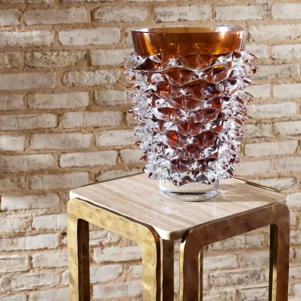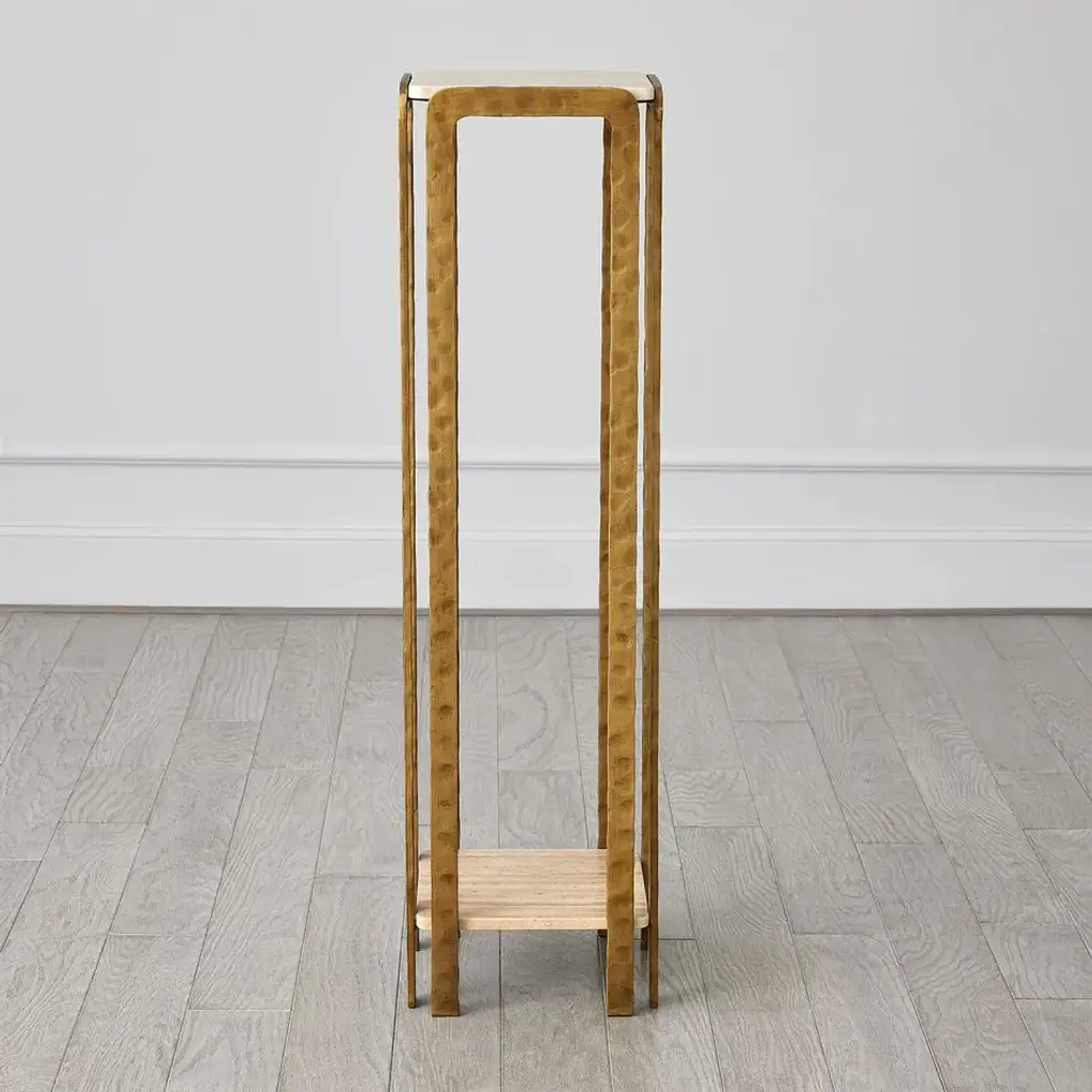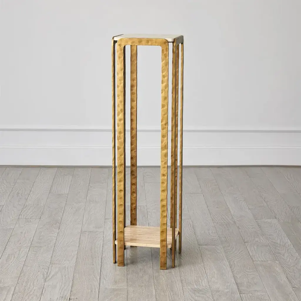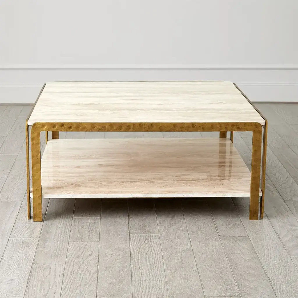 Handcrafted from iron with an antique bronze finish, the Kraft Collection exudes timeless elegance with two travertine surfaces providing the perfect space for your most prized possessions. As travertine is a natural product, please be aware that there will always be variations in veining and color. This is to be expected and makes every travertine product uniquely your own. From a fashion forward perspective, Global Views offers accessories, furniture, statement lighting, and an assortment of rugs and mirrors to add beauty and joy to your home.