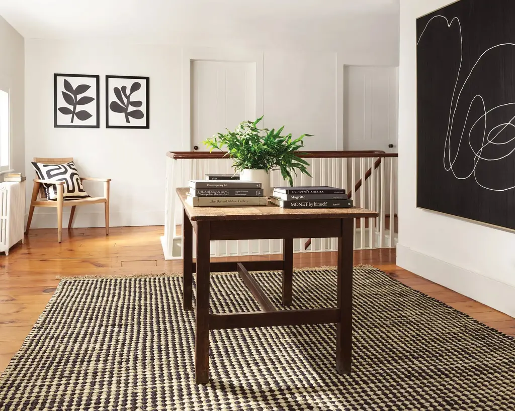 Multi-stranded flatweave rug has a natural warp and alternating black and ivory chunky weft for a textural check that reads like a dot. The natural silky slubby sheen of the jute is artfully presented with this simple, dramatic pattern. This simple flatwoven jute design offers beauty and appeal on a scale that makes it modern and timeless.Eco-friendly, ultra durable and great for any indoor room.