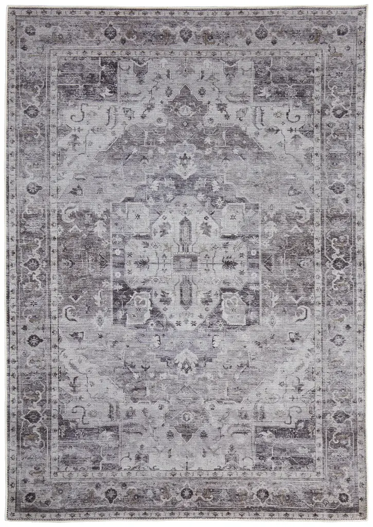 The Kylie collection brings vintage inspiration to life with ornate, worldly designs and a timeless distress effect. The Kylie area rug boasts a Persian-inspired center medallion, short fringe and detail-rich border in a navy, cream, gray, and pastel green colorway. This zero-pile rug is printed on cotton, polyester, and soft chenille for a flat, durable finish. Perfect for high and low trafficked areas of the home, this rug delights in bedrooms, halls, living areas, dining rooms, and entryways.