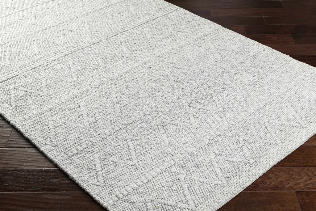 Collection: Kyung Colors: Light Gray Construction: Hand Woven Material: 50% Wool,50% RecycledPETYarn Pile: Medium Pile Pile Height: 0.25" Styles: Transitional,Traditional Backing: Canvas Made In: India Thickness: 0.4" Price Range: $$$$$ (Affordable)