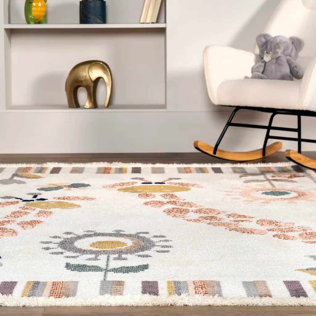 Bring a splash of vibrance to your nursery or children's bedroom with this stunning rug that is available to you in a variety of sizes. The inviting shades add just the right amount of softness, combined with a durable fabrication. Each corner of this beautifully designed floor covering features something else that will captivate anyone who sees it. Designed to enhance any room it's placed in, this pet-friendly and easy to clean area rug comes in an assortment of sizes.