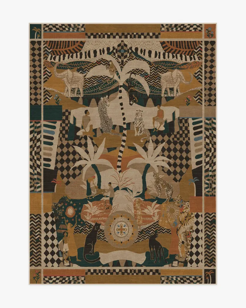 Make inspiration reality with our Architectural Digest La Joie Natural Multicolor Rug, designed by David Quarles IV. Drawing inspiration from imaginative artists like Kehinde Wiley, Dali, Frida Kahlo, and Basquiat, this design is a visual storytelling of the Garden of Eden. Its colorful display of figures, nature, and animals weaves a folky, patchworked composition that exudes a tropical, joyful ambiance. Taupe, charcoal, mustard, ginger, teal, and coral play atop a cream background. Water-resistant, stain-resistant, and machine-washable. Rug colors may vary slightly according to your device and the lighting in your space.