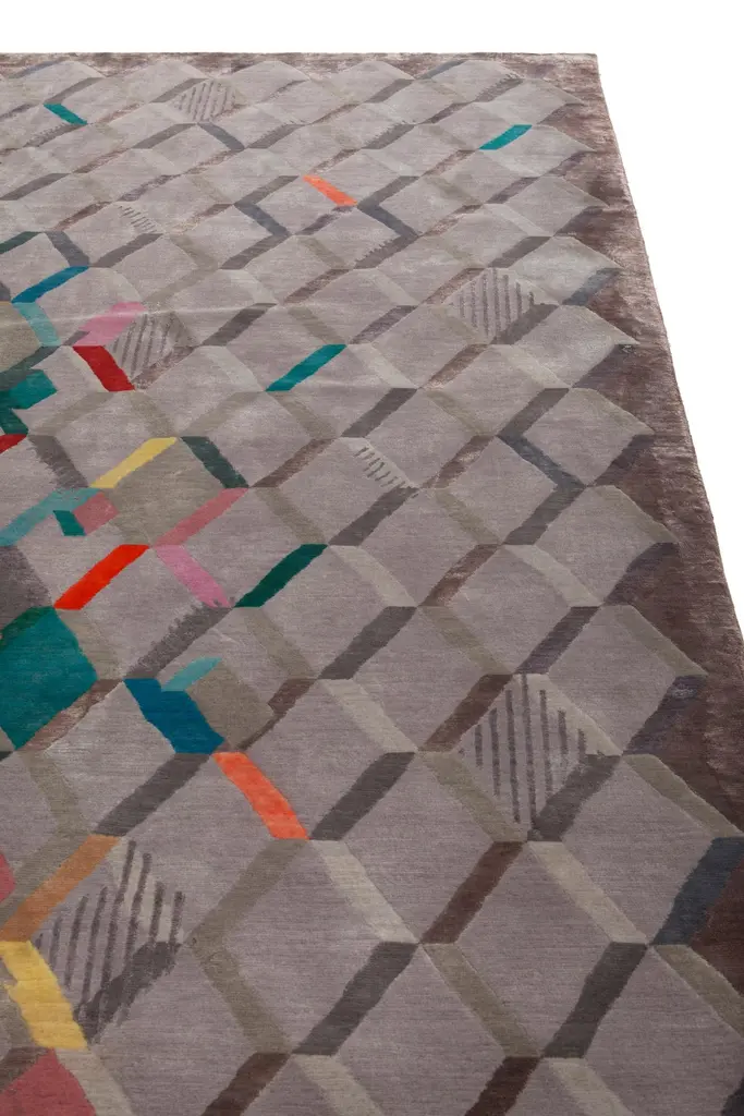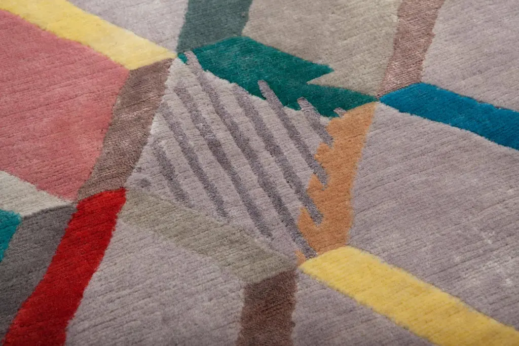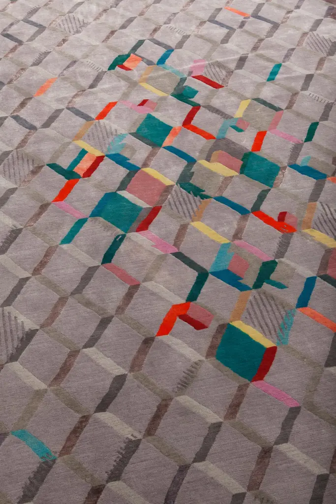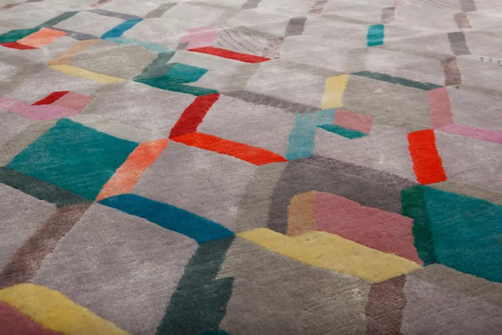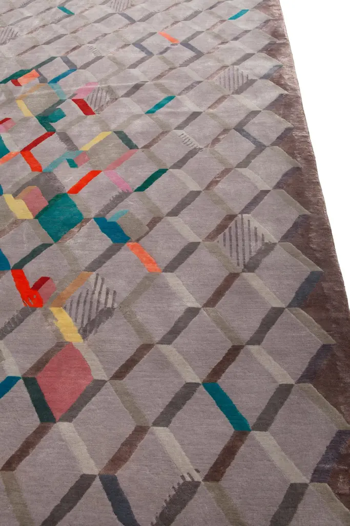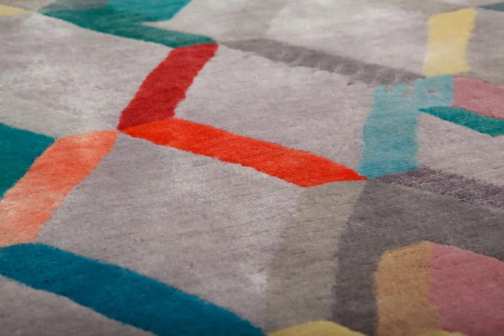 This rug is made of wool and silk. A very rich carpet that represents the succession of houses in the suburbs of Mexico City. From year to year these houses are painted with the available colors, usually very bright.A spontaneous and irregular mosaic.