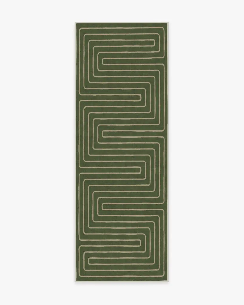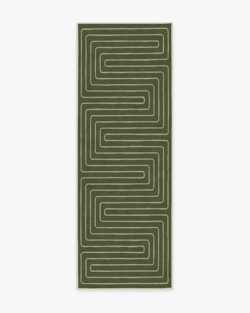 Irregular linework inspired by hand-cut paper softens a large scale maze pattern. Our Jonathan Adler Labyrinth Fern Green Rug features a continuous neutral line with a hand-drawn feel on a rich green background. Water-resistant, stain-resistant, and machine-washable. Rug colors may vary slightly according to your device and the lighting in your space.