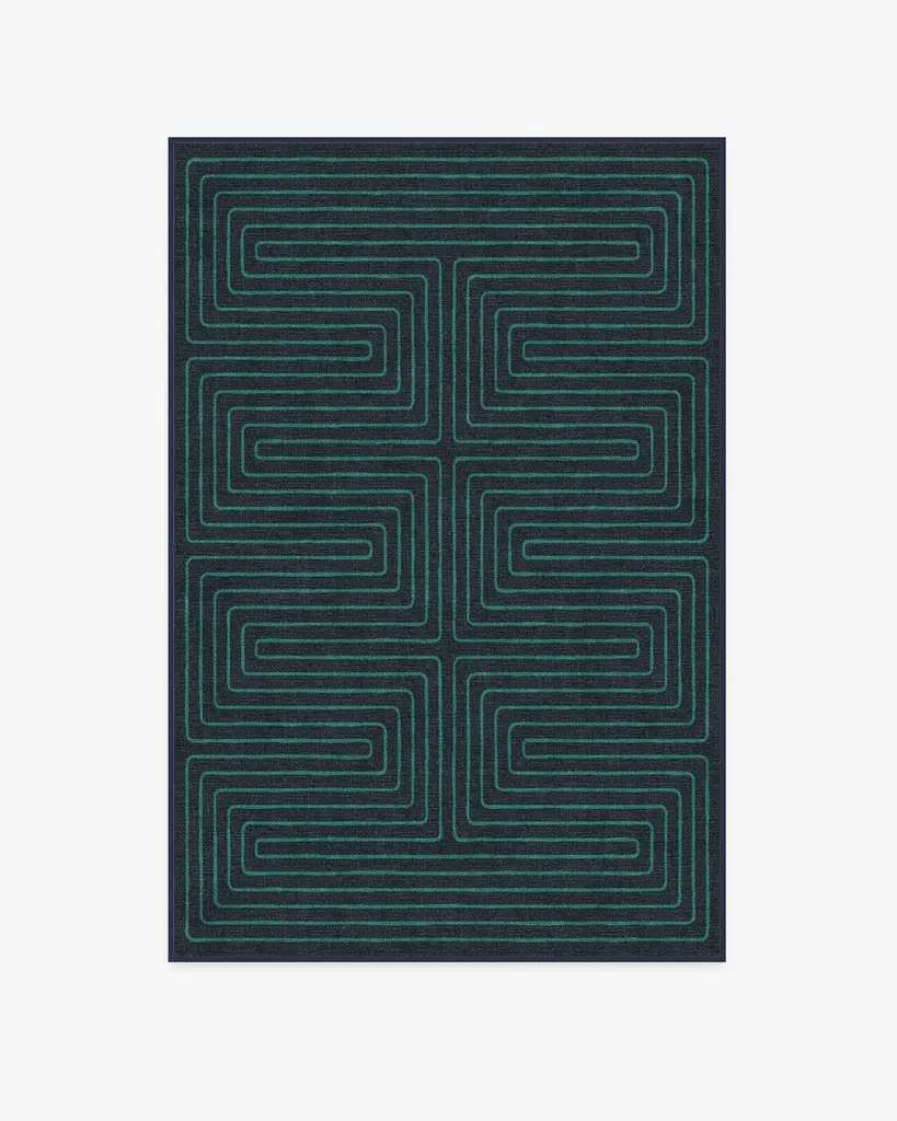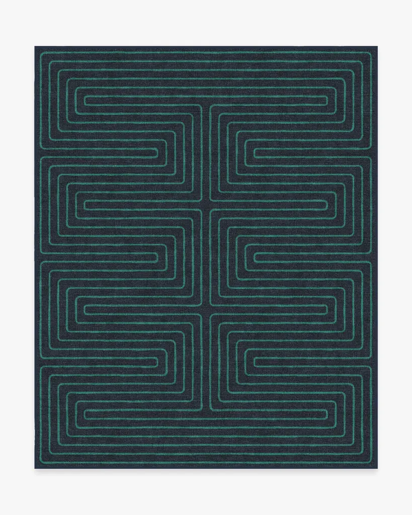 Irregular linework inspired by hand-cut paper softens a large scale maze pattern. Our Jonathan Adler Labyrinth Navy and Teal Rug features a continuous line with a hand-drawn feel in teal on a navy background. Water-resistant, stain-resistant, and machine-washable.