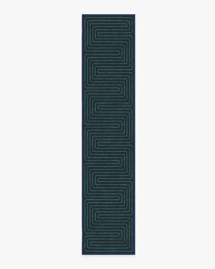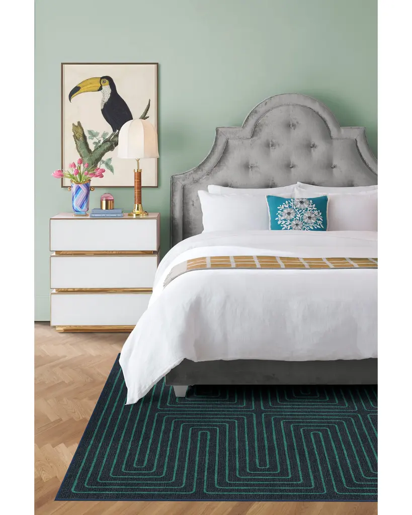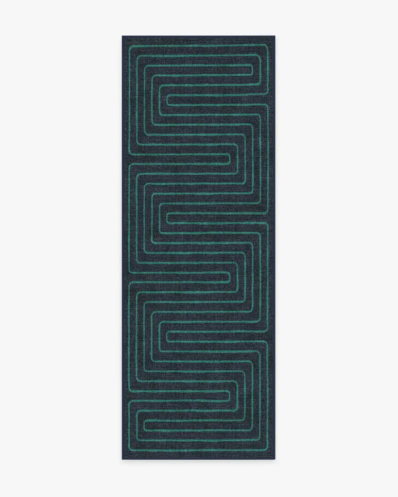 Irregular linework inspired by hand-cut paper softens a large scale maze pattern. Our Jonathan Adler Labyrinth Navy and Teal Rug features a continuous line with a hand-drawn feel in teal on a navy background. Water-resistant, stain-resistant, and machine-washable.