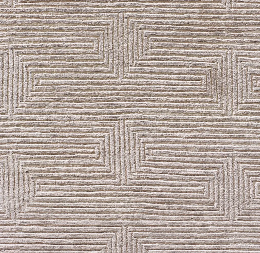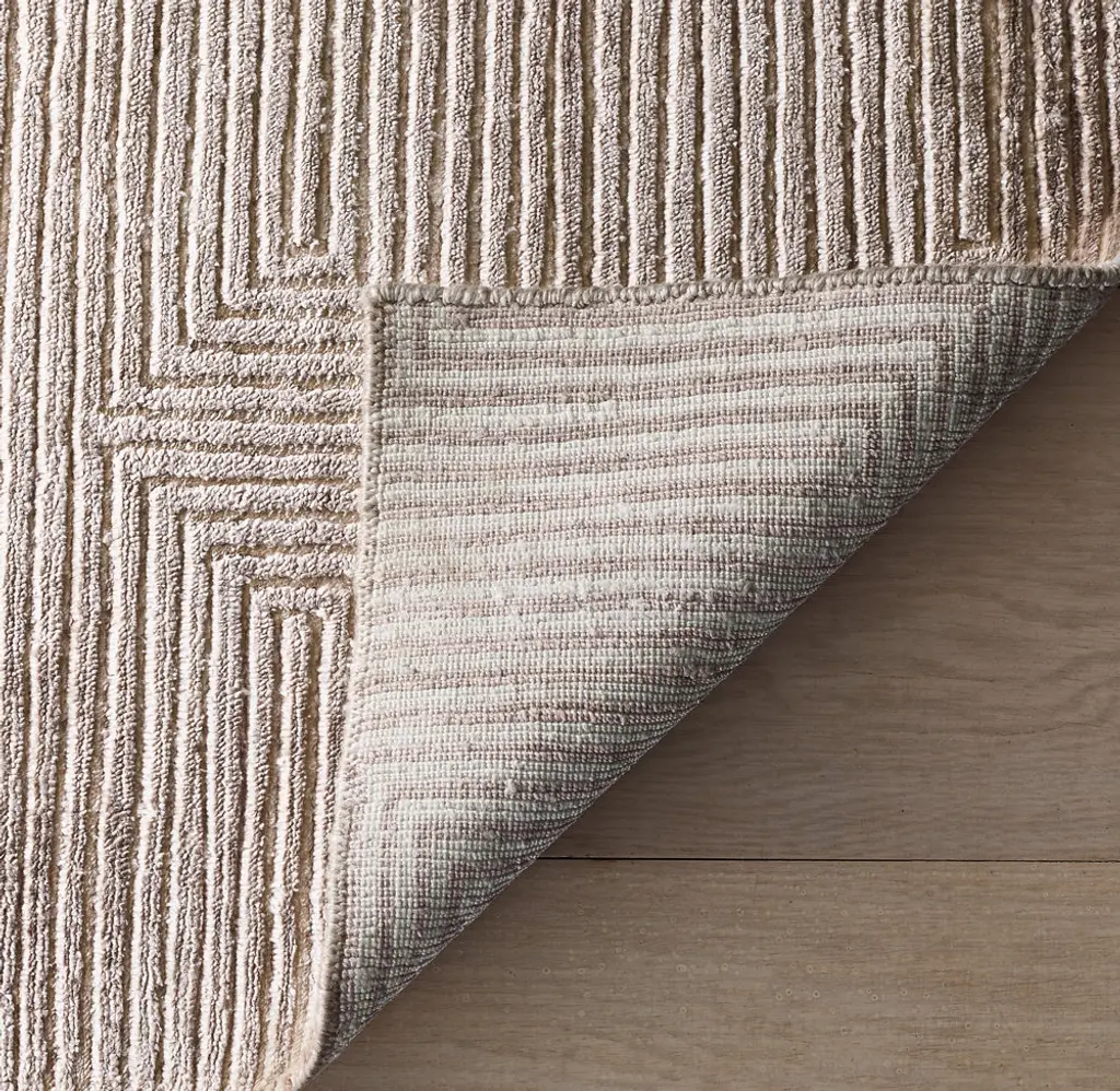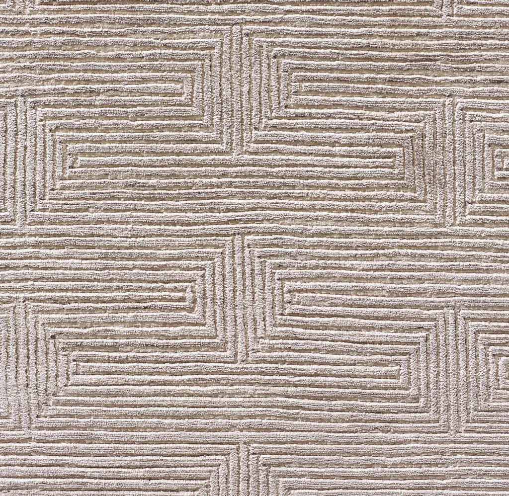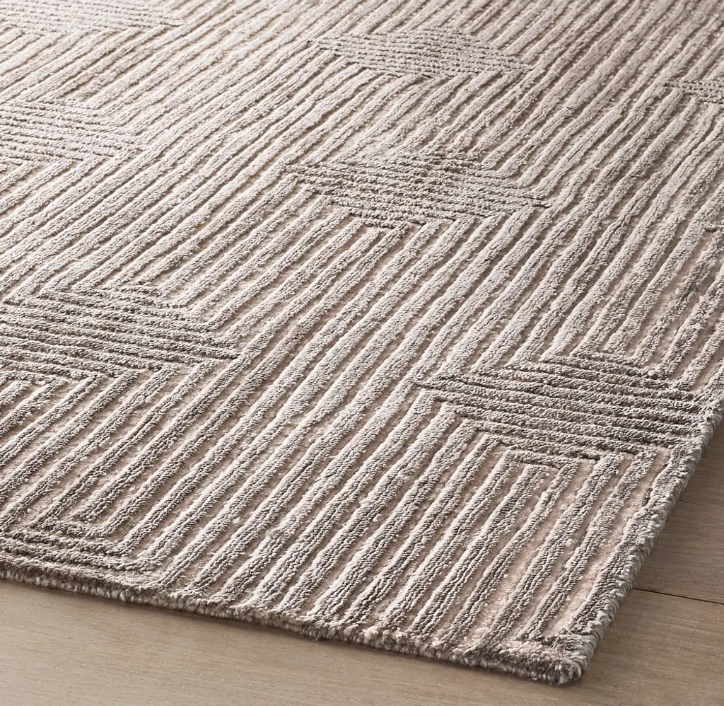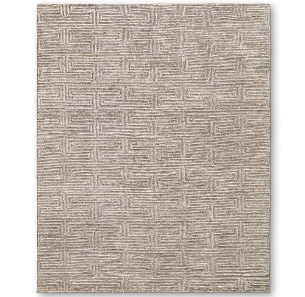 Narrow channels of carved pile trace an infinite labyrinth across our rug, the rectangular lines appearing to turn corners and transition into diamonds. Pure viscose enhances the undulating effect with its high-low luster and sumptuous feel.