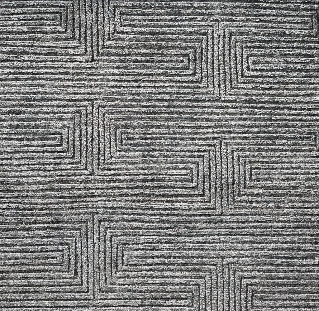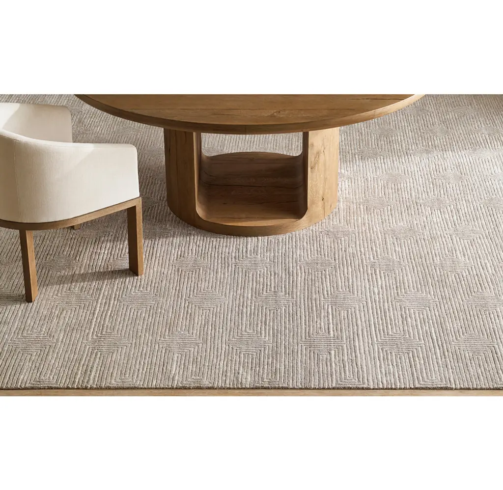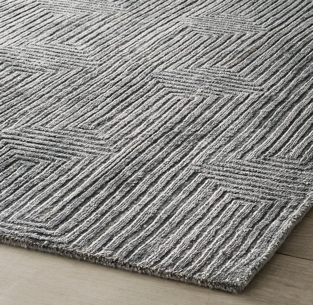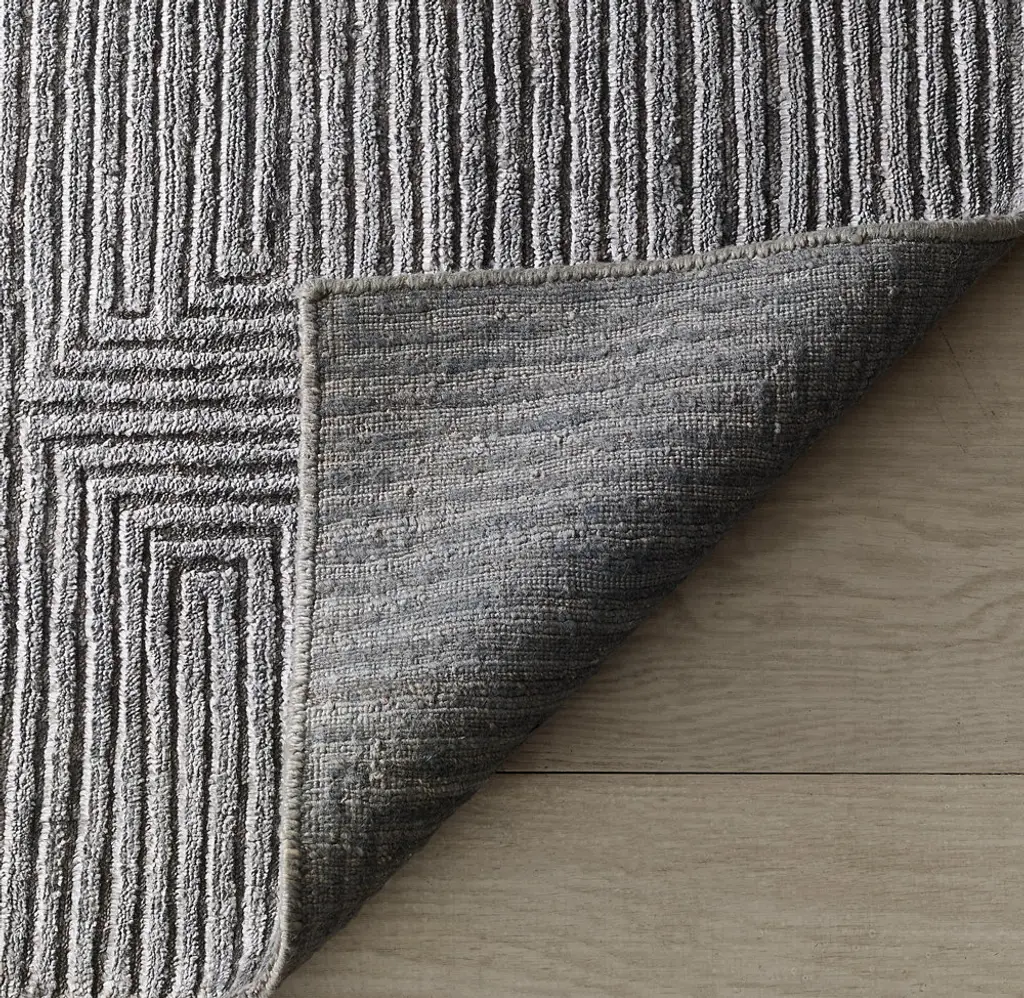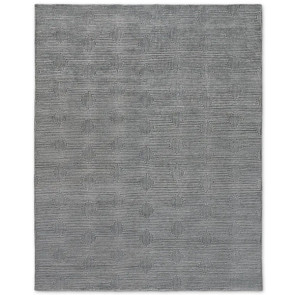 Narrow channels of carved pile trace an infinite labyrinth across our rug, the rectangular lines appearing to turn corners and transition into diamonds. Pure viscose enhances the undulating effect with its high-low luster and sumptuous feel.