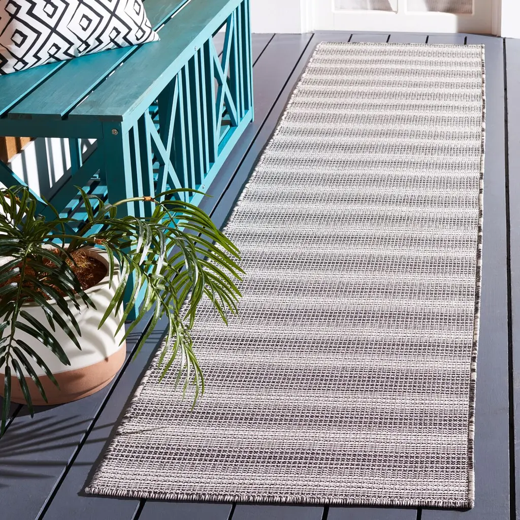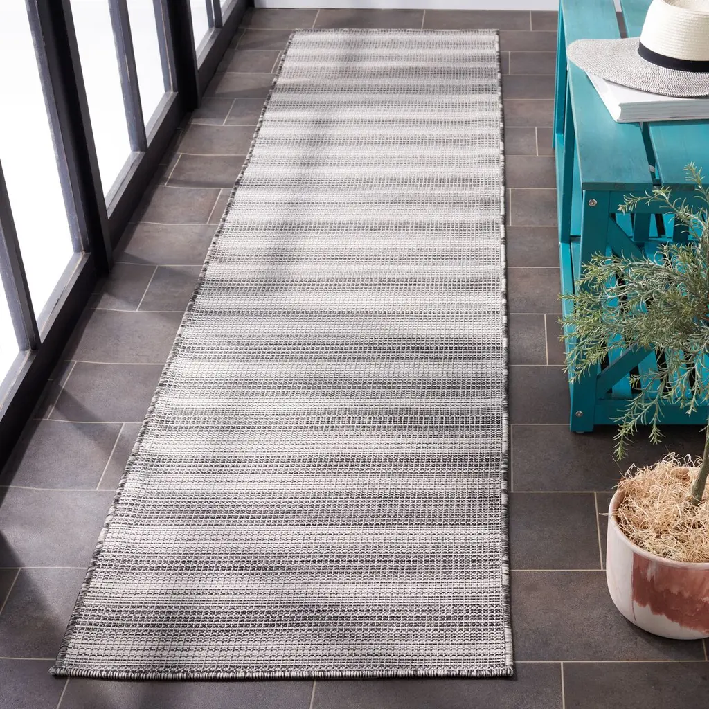 Tonal variations add to the artisanal appeal of this durable striped rug. Designed to withstand the elements, it will bring flair to high-traffic outdoor and indoor spaces alike. The rug is especially easy to clean: You can even hose it down. Latex backing adds to its longevity. The rug is Oeko-Tex Standard 100 certified, meaning it has been tested for harmful substances.