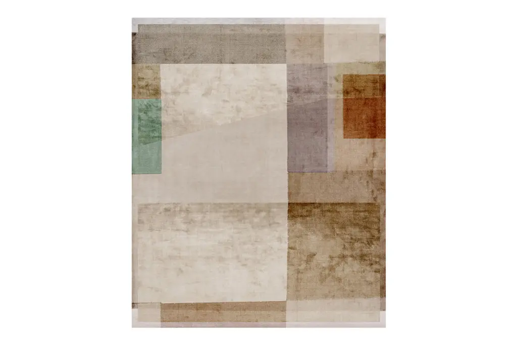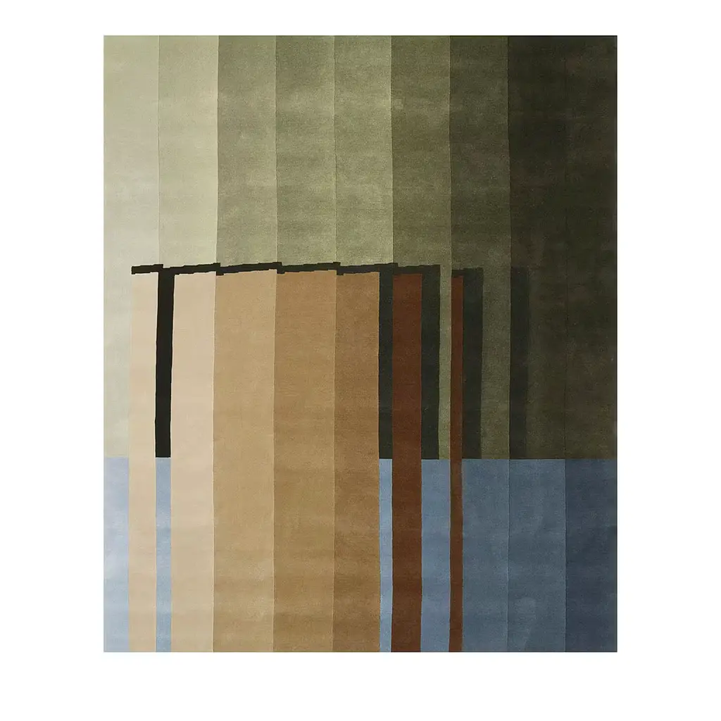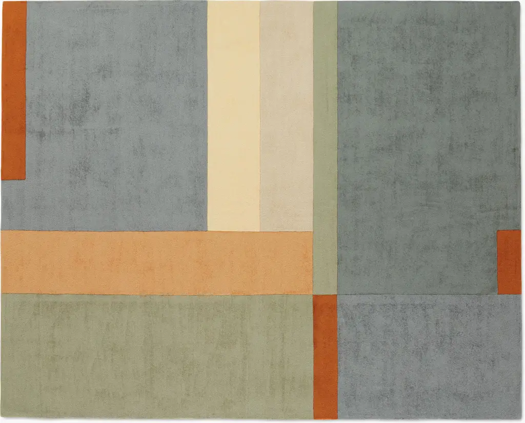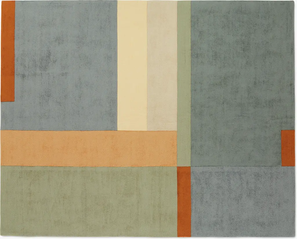 Designed by textile artist Ellen van Dusen, the Landscape Rug (2021) offers an abstract interpretation of a mountain scene. Elements are broken down into proportionally sized rectangles, each rendered in a soft hue. Completely crafted from New Zealand wool, the floor covering is durable and comfortable underfoot, making it an ideal choice for living rooms and other high-traffic spaces. Some shedding is natural; do not vacuum with a brush roller. Made in India.