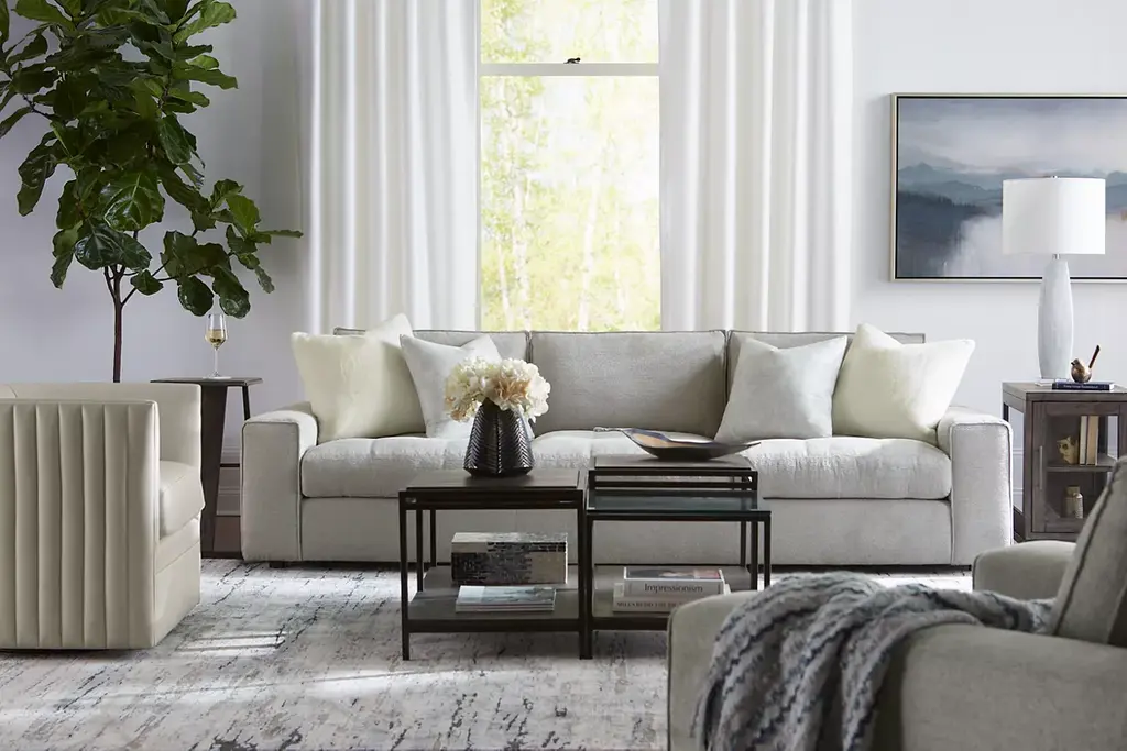 Enhance your décor with our Langdon rug. Machine woven in contemporary shades of grey, beige and blue, this decorative floor covering will add a touch of dynamic, abstract design to your space.