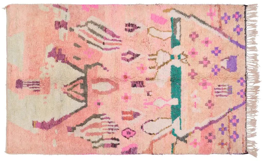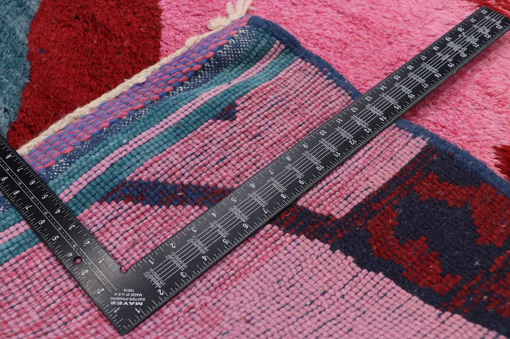 Cubism meets nomadic charm in this hand knotted wool Berber Moroccan rug. The visual complexity and intense color palette woven into this piece work together creating a bold, expressionist design. An allover pattern of unusual geometric shapes and color block fragments cover the hot pink backdrop. A joy to walk upon, the pile is soft and plush with lavish texture while simultaneously introducing the modern trend for high-end design.