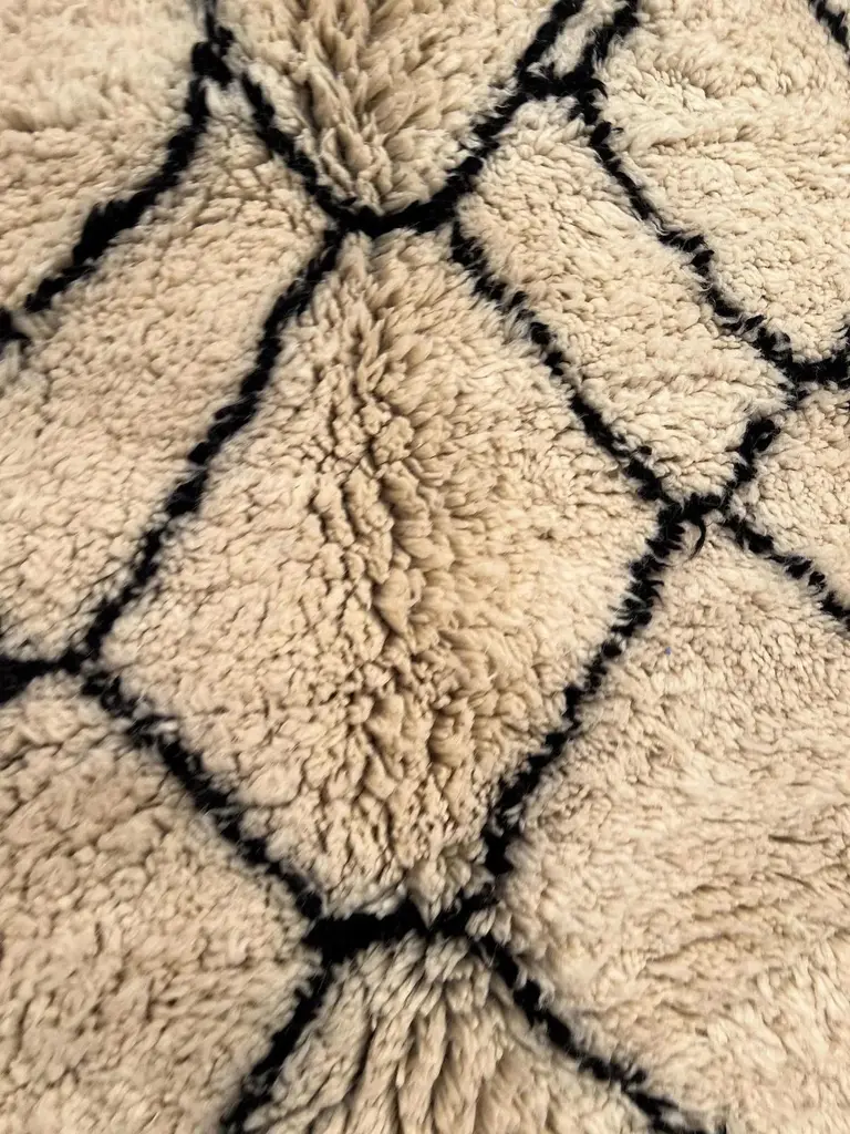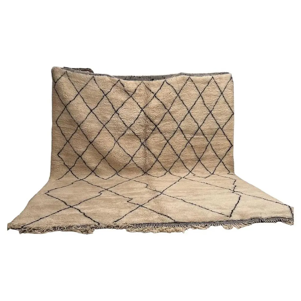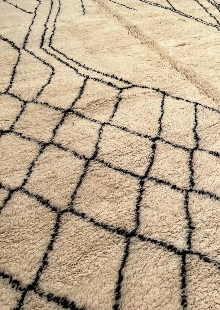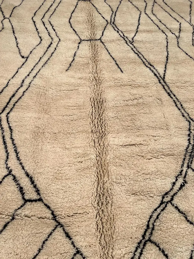 This large cream neutral handwoven Moroccan rug was made by hand by skilled artisans in the Atlas Mountains using the highest quality M'Rirt wool. It is impressive in both size and design, and is the perfect luxury statement piece for any room. A warm cream base forms the background for a classic abstract Moroccan line design in black wool. This rug measures approximately 10'3" x 13'8" feet and is the ideal anchor for bedroom, living room, or any other large space. The 100% high quality Moroccan wool construction makes for a very soft and luxurious feel underfoot. A long pile adds to ultra soft luxury feel.