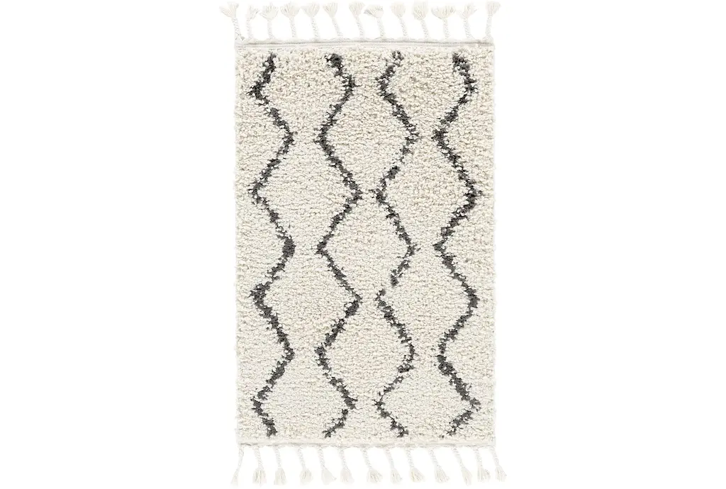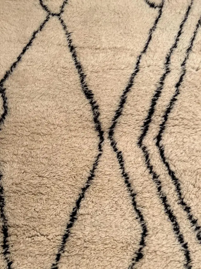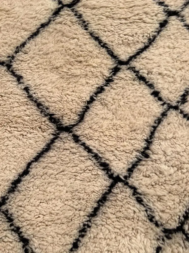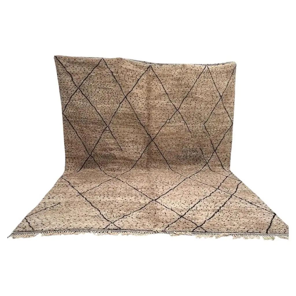 This large cream neutral handwoven Moroccan rug was made by hand by skilled artisans in the Atlas Mountains using the highest quality M'Rirt wool. It is impressive in both size and design, and is the perfect luxury statement piece for any room. A warm cream base forms the background for a classic abstract Moroccan line design in black wool. This rug measures approximately 10'3" x 13'8" feet and is the ideal anchor for bedroom, living room, or any other large space. The 100% high quality Moroccan wool construction makes for a very soft and luxurious feel underfoot. A long pile adds to ultra soft luxury feel.