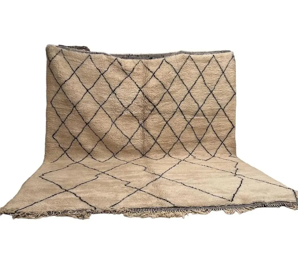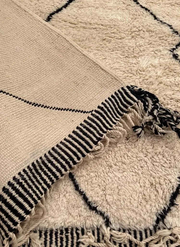 This large cream neutral handwoven Beni Ourain rug was made by hand by skilled artisans in the Atlas Mountains using the highest quality Moroccan wool. It is impressive in both size and design, and is the perfect luxury statement piece for any room. A warm cream base forms the background for a modern take on a classic abstract Moroccan line design in black wool. This hand-knotted rug is extra large, and measures approximately 11'3" x 13'1" feet. The combined classic design and expansive size make this carpet an ideal anchor for bedroom, living room, or any other large space. The 100% high quality Moroccan wool construction makes for a very soft and luxurious feel underfoot. A long pile adds to ultra soft luxury feel. This rug features tassels or fringe on both ends.