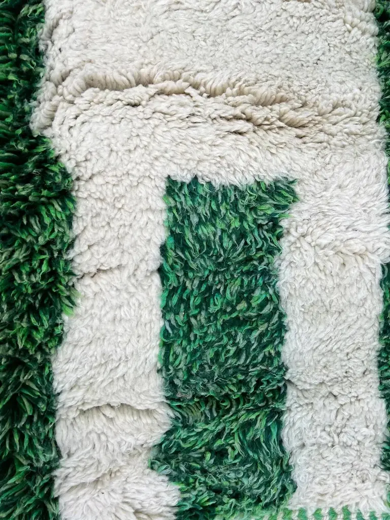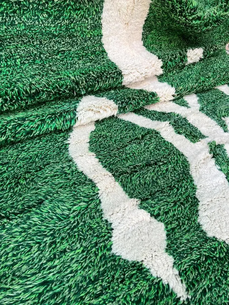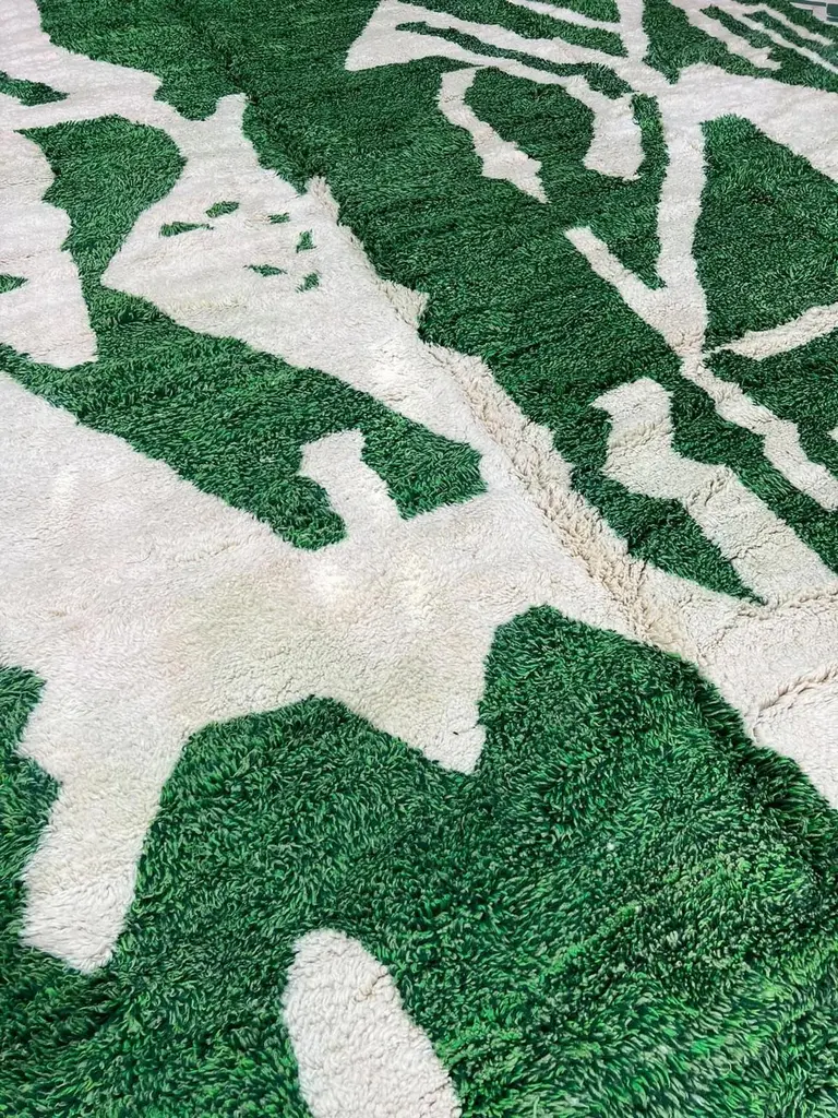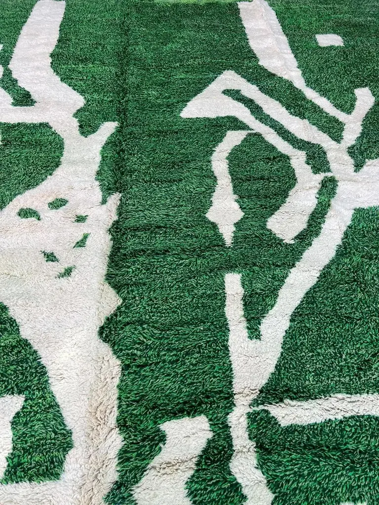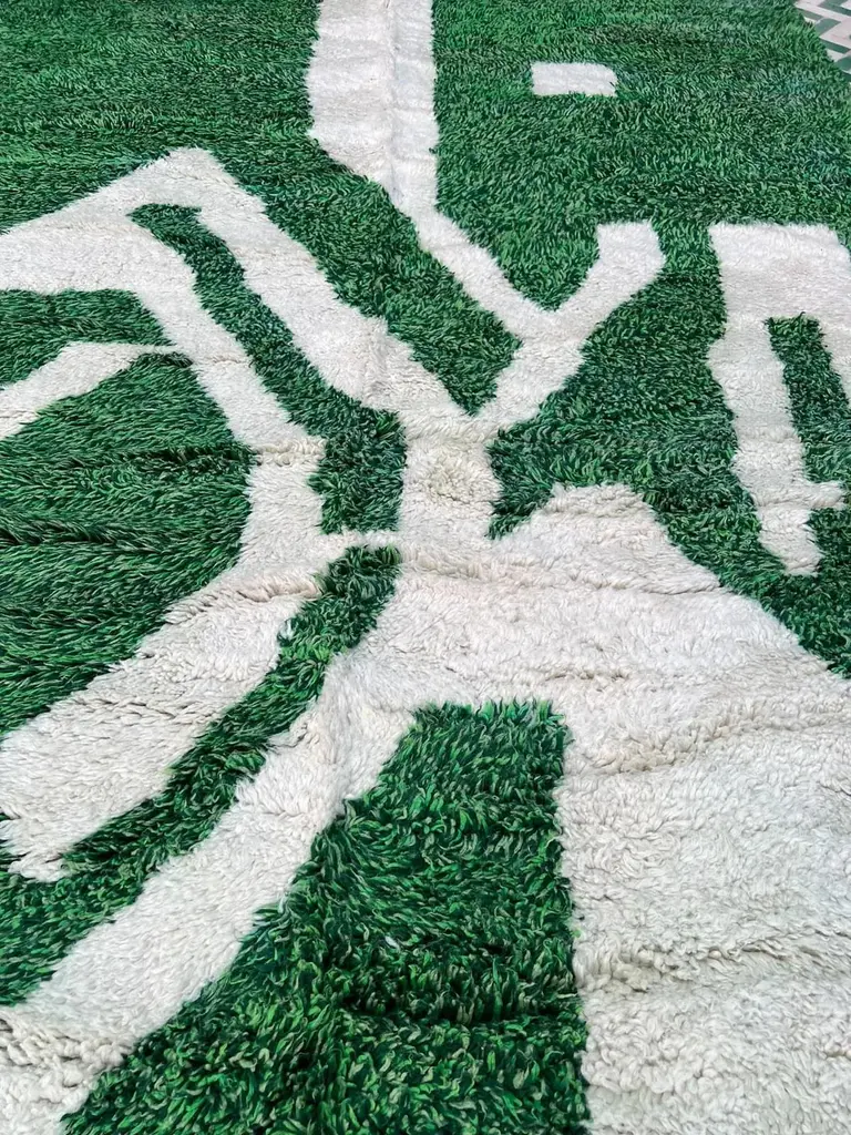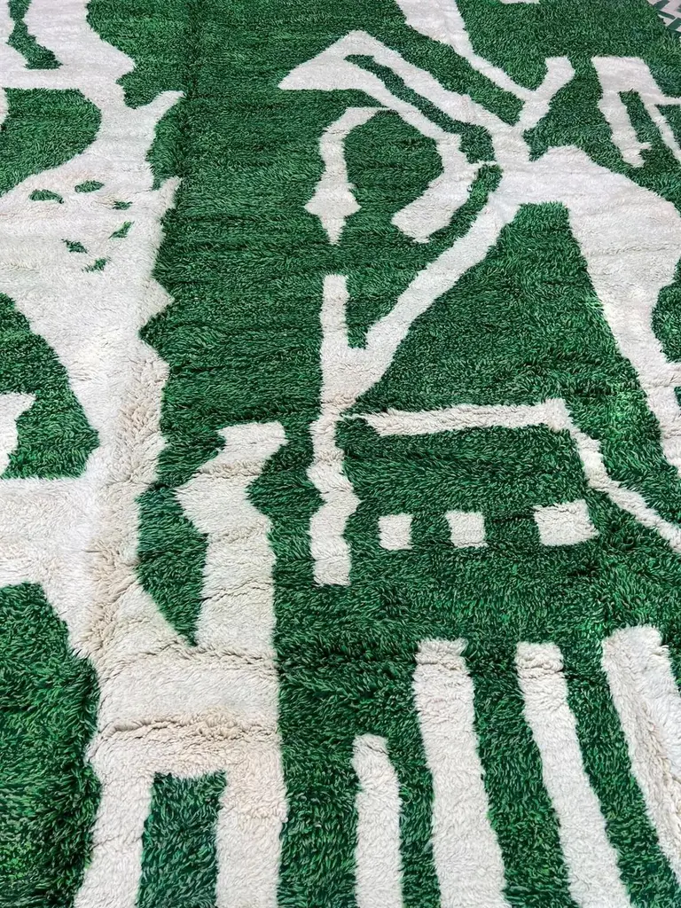 This large green handwoven Moroccan rug was made by hand by skilled artisans in the Atlas Mountains using the highest quality M'Rirt wool. It is impressive in both size and design, and is the perfect luxury statement piece for any room. The base of this carpet is a rich, vibrant green color and it features an abstract cream colored tribal design. The 100% high quality wool construction makes for a very soft feel underfoot. This rug measures approximately 10'1" x 14".